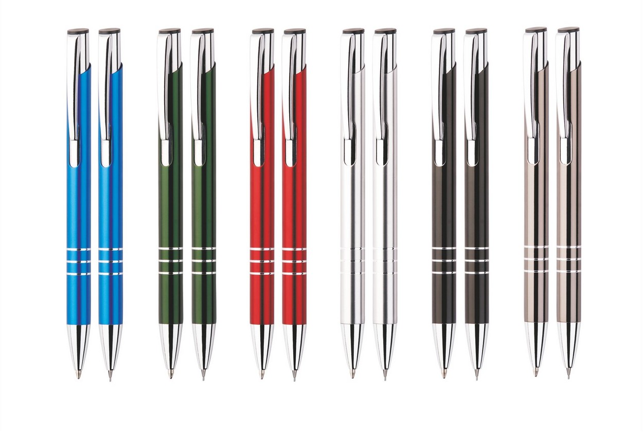 Der Kugelschreiber aus Metall mit farbigem, oxidiertem Schaft, silbernen Ringen, silberner Clip und Spitze. Dazu ein Druckbleistift im Design des Kugelschreibers.