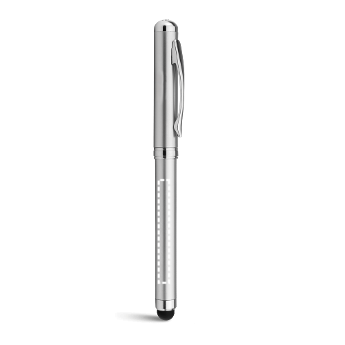 Multifunktionskugelschreiber aus Metall mit blauschreibender Mine und Clip. Dieser Kugelschreiber besteht aus einer Minitaschenlampe mit LED Licht, einem Laserpointer und hat eine Touchpen-Funktion. Enthält 3 LR41-Batterien. Geliefert in einem Geschenketui aus Metall. ø10 x 125 mm | Etui: 178 x 38 x 19 mm