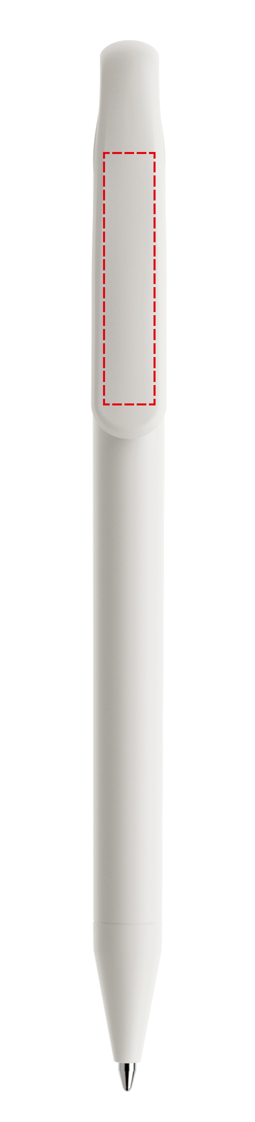 In der Ausführung mit mattem Gehäuse (TMM) lieferbar in drei Standardfarben, hergestellt mit einem Rezyklatanteil von 100% (Schwarz und Weiß) oder 50% (alle anderen Farben), gekennzeichnet mit dem internationalen Recycling-Symbol. Sondergehäusefarben ab 10.000 Stück. Fünf Druckflächen für Werbeanbringungen stehen zur Verfügung. Der optionale Kappenpunkt ist auf beiden Seiten in fünf Farben bedruckbar. Ausgestattet mit der umweltfreundlichen auswechselbaren FLOATING BALL® lead free-Großraummine 1.0, Schreiblänge 5.000 m, Schreibfarbe Blau oder Schwarz.