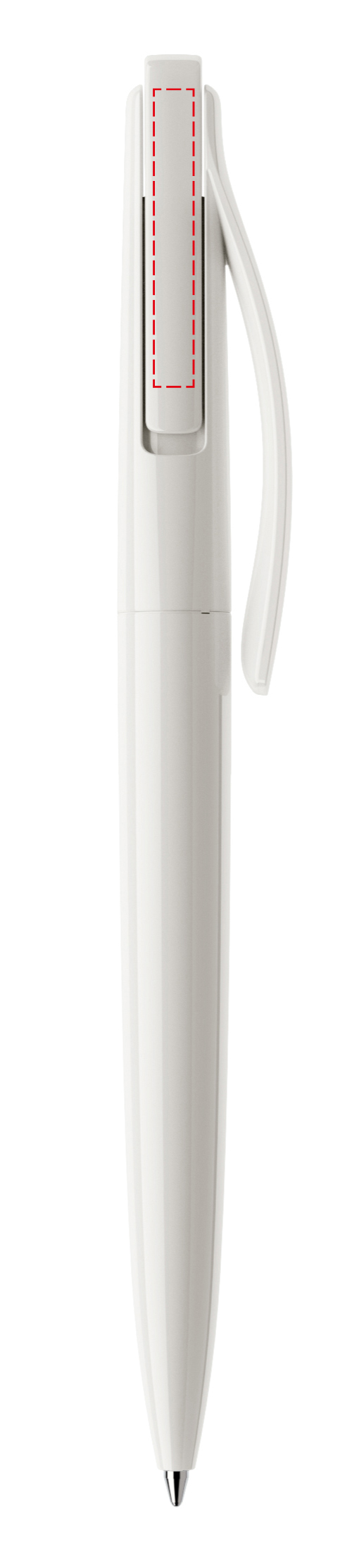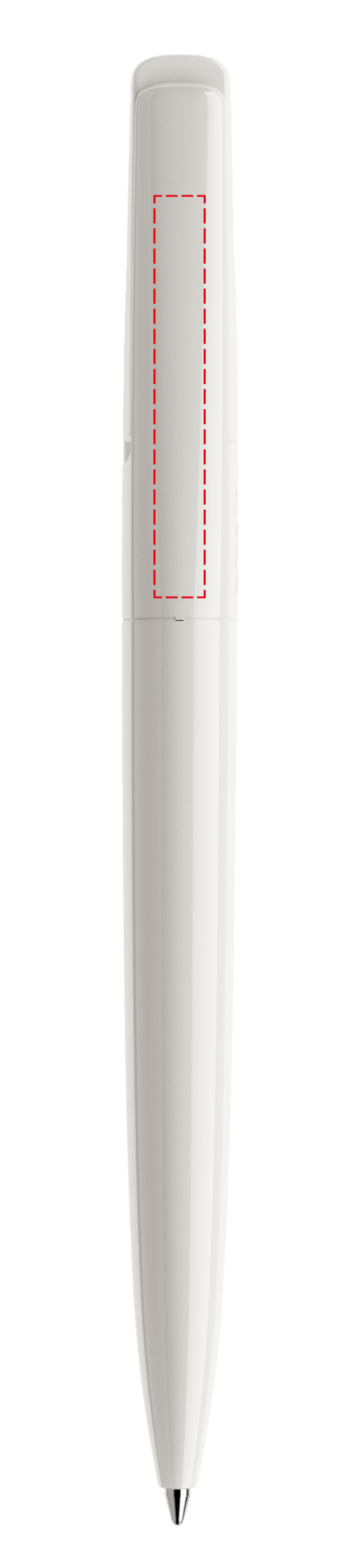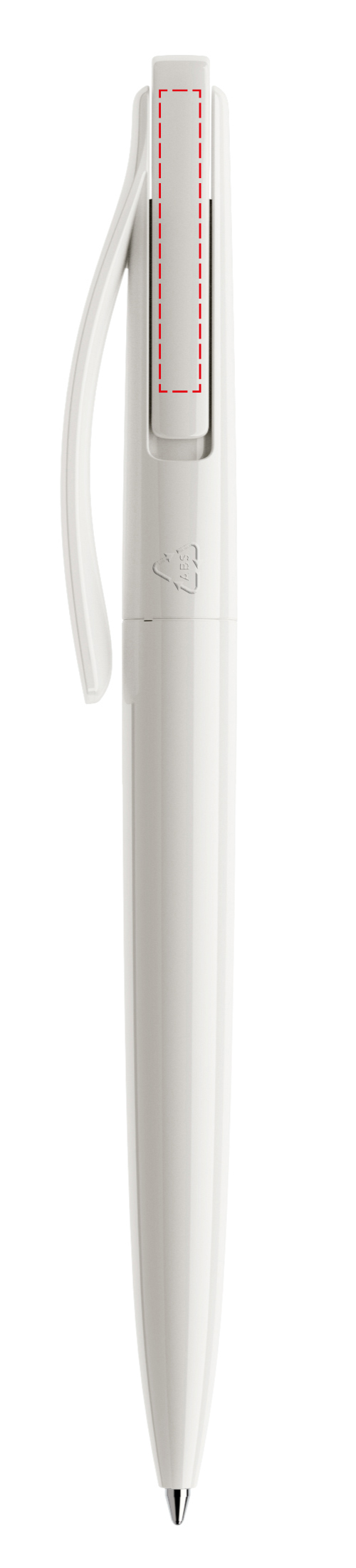In der Ausführung mit vollfarben poliertem Gehäuse (PPP) lieferbar in Schwarz und Weiß, hergestellt mit einem Rezyklatanteil von 100%, gekennzeichnet mit dem internationalen Recycling-Symbol. Sondergehäusefarben ab 10.000 Stück. Fünf Druckflächen für Werbeanbringungen stehen zur Verfügung. Der beidseitig bedruckbare Druckknopf ist in neun transparenten und neun polierten Farben erhältlich und kann nach Belieben kombiniert werden. Ausgestattet mit der umweltfreundlichen auswechselbaren FLOATING BALL® lead free-Großraummine 1.0, Schreiblänge 5.000 m, Schreibfarbe Blau oder Schwarz.