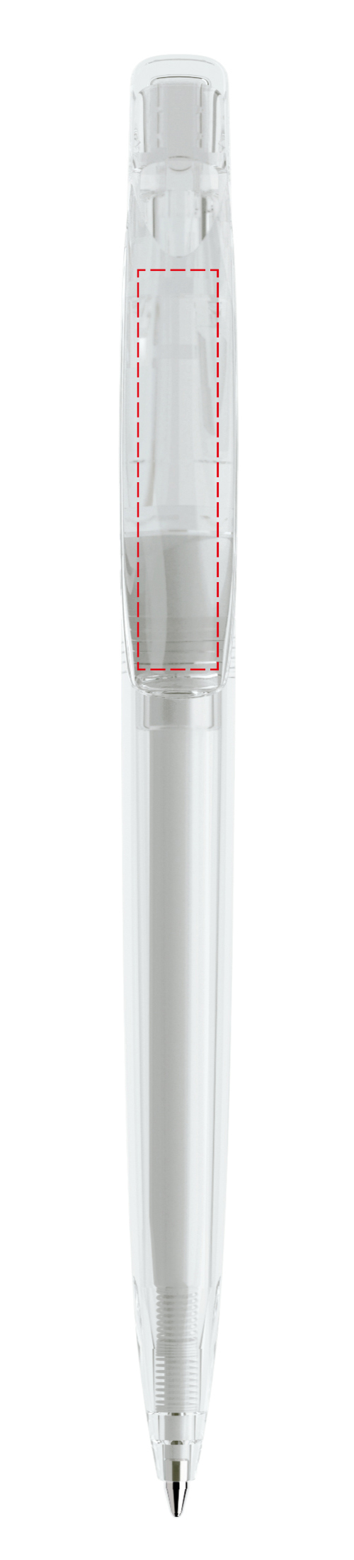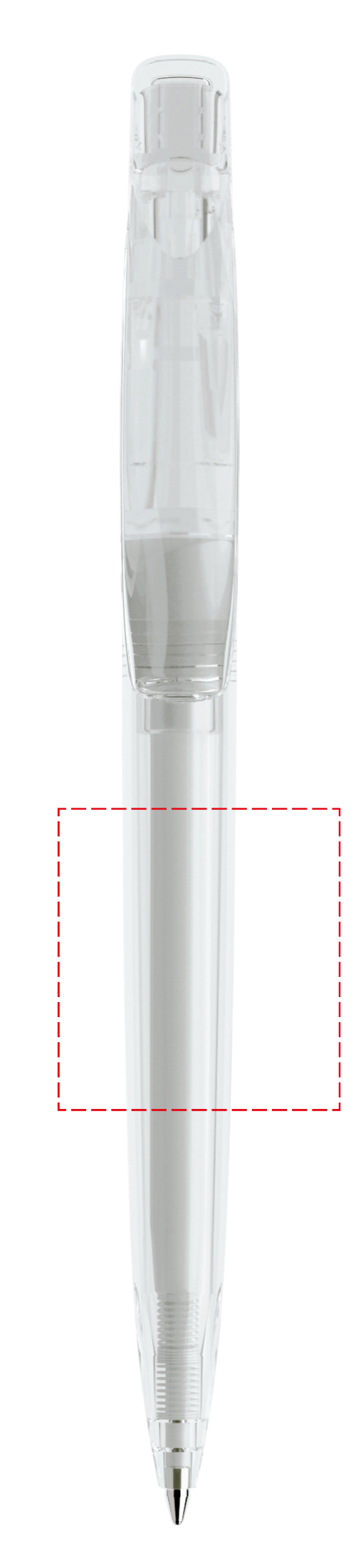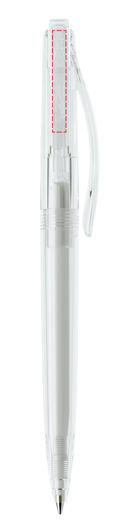 In der Ausführung mit transparentem Gehäuse (PTT) lieferbar in zwei Standardfarben, hergestellt mit einem Rezyklatanteil von 50%, gekennzeichnet mit dem internationalen Recycling-Symbol. Sondergehäusefarben ab 10.000 Stück. Fünf Druckflächen für Werbeanbringungen stehen zur Verfügung. Der beidseitig bedruckbare Druckknopf kann vom Gehäuse abgesetzt werden. Ausgestattet mit der umweltfreundlichen auswechselbaren FLOATING BALL® lead free-Großraummine 1.0, Schreiblänge 5.000 m, Schreibfarbe Blau oder Schwarz.