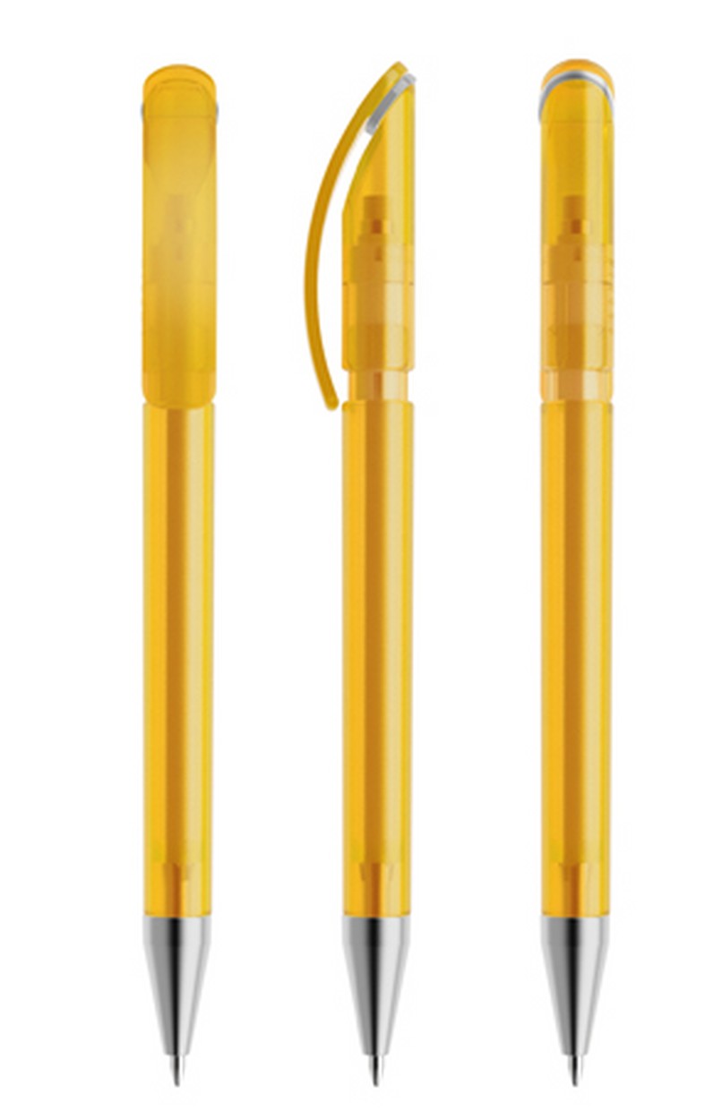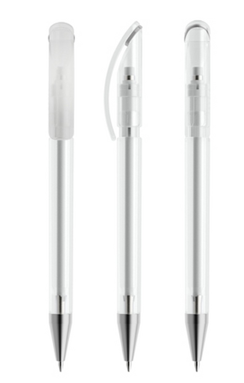 Als Druckbleistift mit gefrostetem Gehäuse und satinierter Metallspitze (MFS) lieferbar in fünf Standardfarben, Sondergehäusefarben ab 5'000 Stück. Vier Druckflächen für Werbeanbringungen stehen zur Verfügung. Optional kann die Kappe mit einem farblich abgesetzten Ring konfektioniert werden. Stabile Doppeldruckmechanik mit versenkbarer Edelstahlspitze für mittelharte, mit Polymeren angereicherte 0,7 mm HB-Minen. Integrierter Qualitätsradierer.