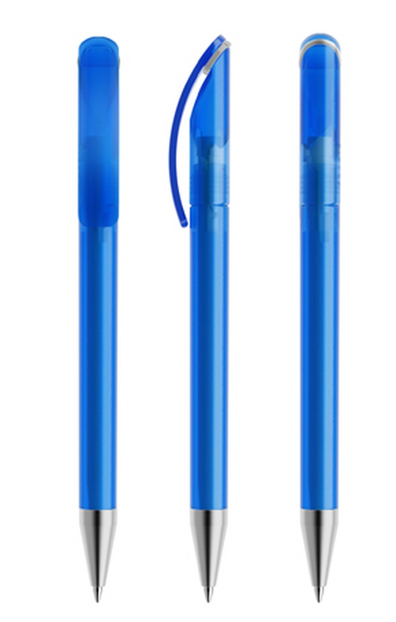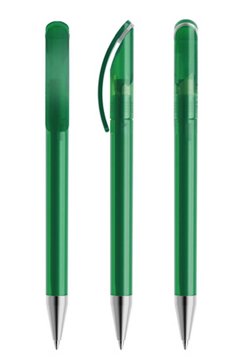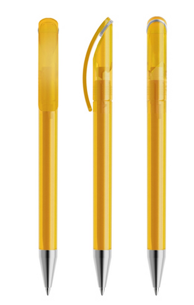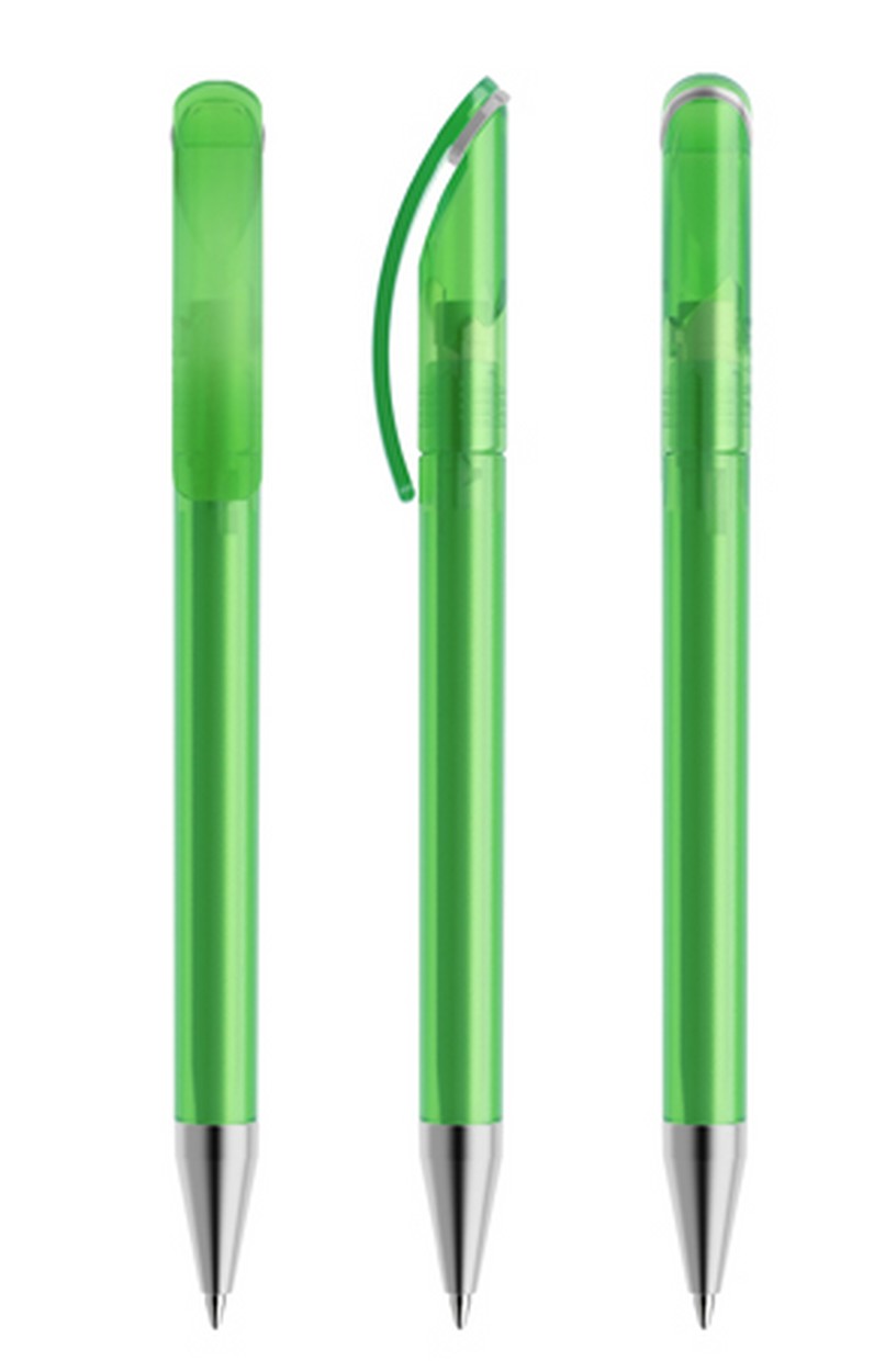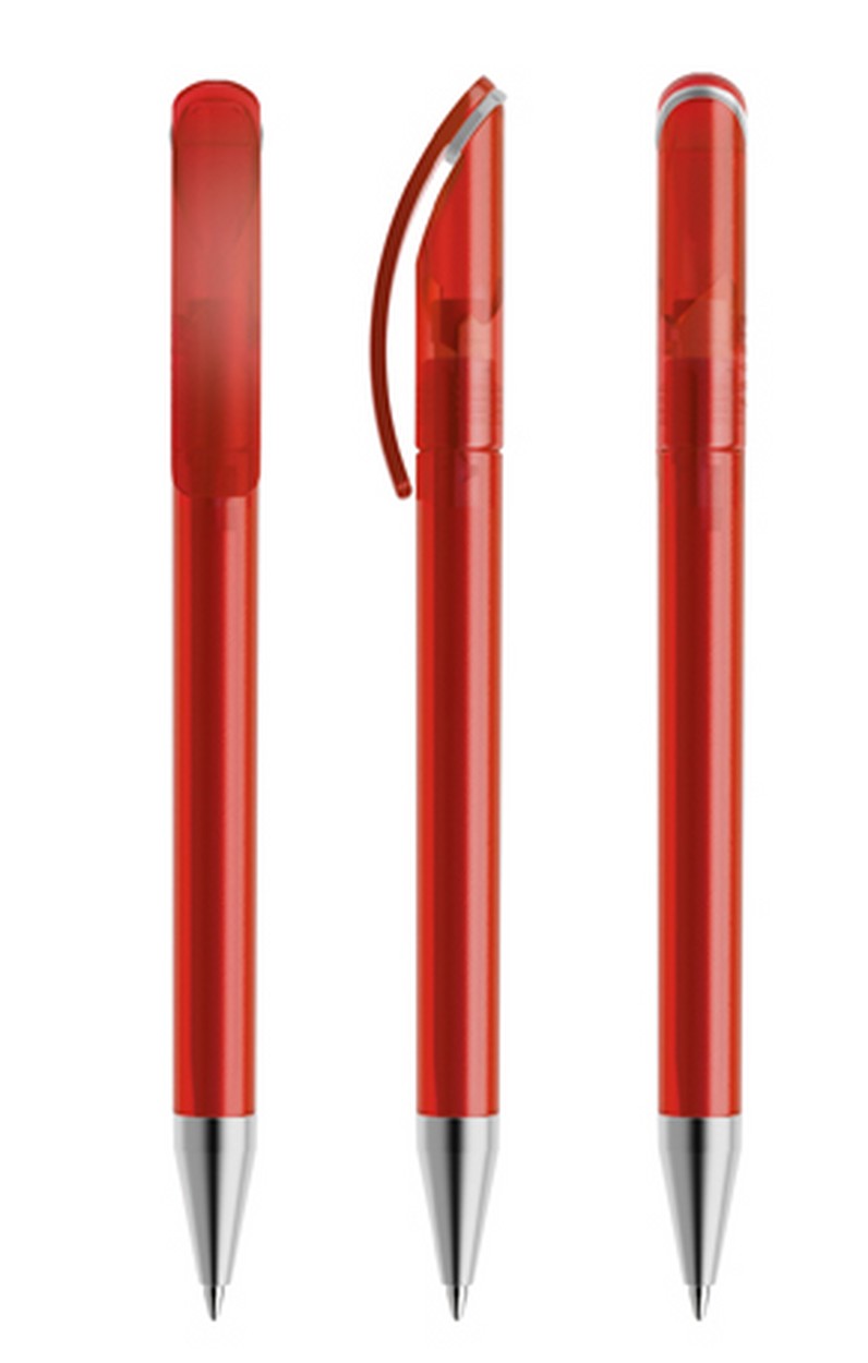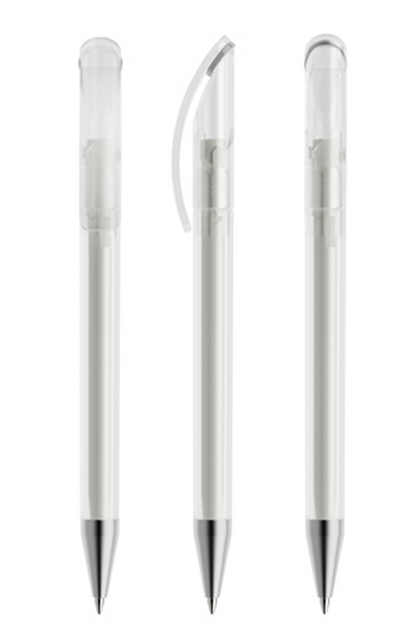 Als Drehkugelschreiber mit gefrostetem Gehäuse und satinierter Metallspitze (TFS) lieferbar in zwölf Standardfarben, Sondergehäusefarben ab 5'000 Stück. Vier Druckflächen für Werbeanbringungen stehen zur Verfügung. Optional kann die Kappe mit einem farblich abgesetzten Ring konfektioniert werden. Das hochwertige neue FLOATING BALL ® Schreibsystem sorgt für ein noch weicheres Schreibgefühl.