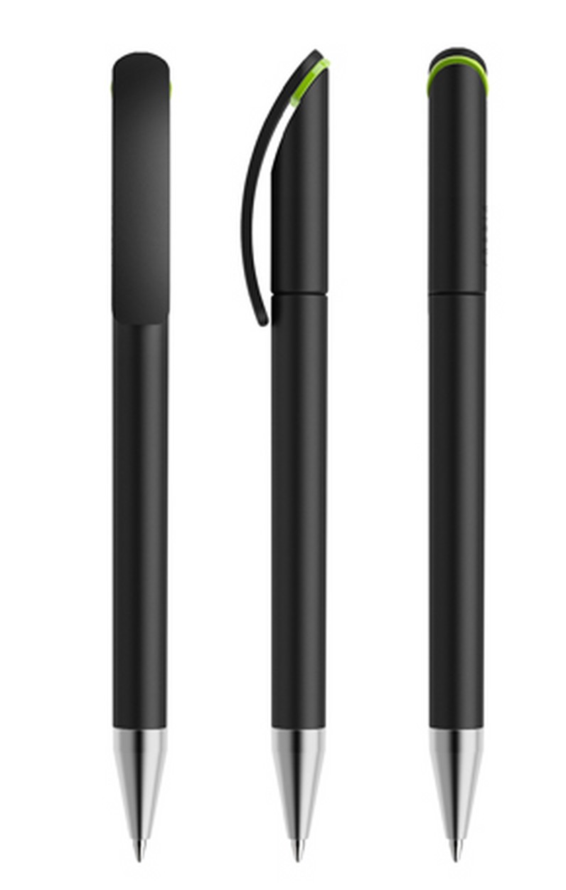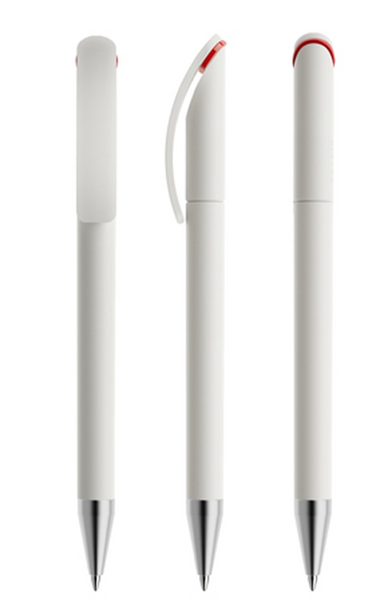 Als Drehkugelschreiber mit mattem Gehäuse und satinierter Metallspitze (TMS) lieferbar in den Standardfarben Schwarz und Weiß, Sondergehäusefarben ab 5'000 Stück. Vier Druckflächen für Werbeanbringungen stehen zur Verfügung. Optional kann die Kappe mit einem farblich abgesetzten Ring konfektioniert werden. Das hochwertige neue FLOATING BALL ® Schreibsystem sorgt für ein noch weicheres Schreibgefühl.