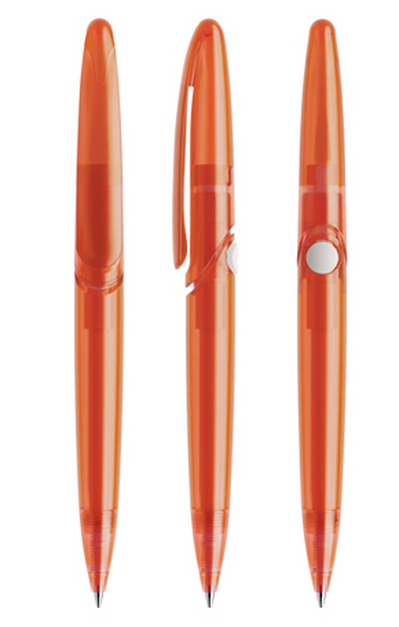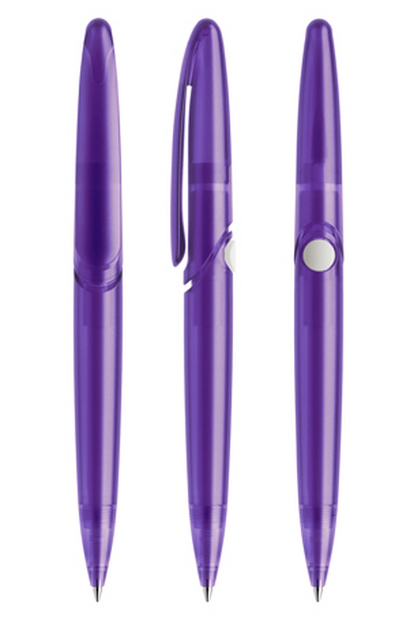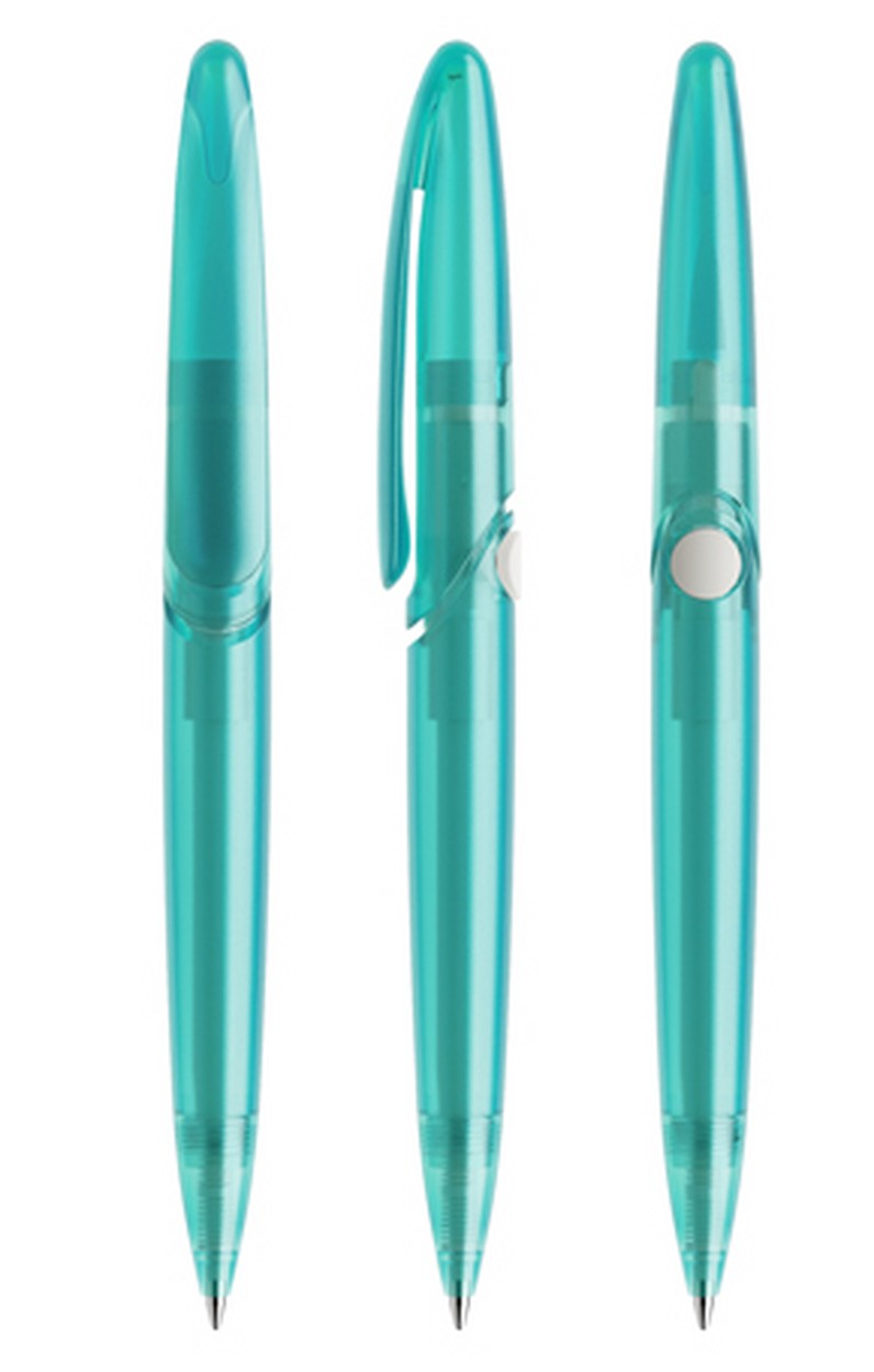 In der Ausführung mit gefrostetem Gehäuse (PFF) lieferbar in elf Standardfarben, Sondergehäusefarben ab 10'000 Stück. Vier Druckflächen für Werbeanbringungen stehen zur Verfügung. Der Druckknopf lässt sich farblich vom Gehäuse absetzen. Das hochwertige neue FLOATING BALL ® Schreibsystem sorgt für ein noch weicheres Schreibgefühl.