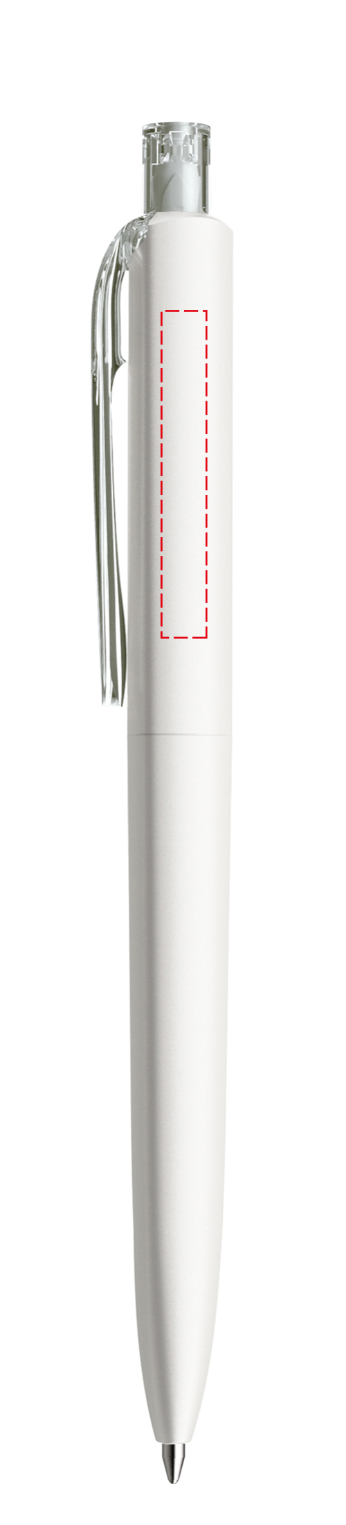 In der Ausführung mit vollfarben mattem Gehäuse (PMM) lieferbar in sechs Standardfarben, hergestellt mit einem Rezyklatanteil von 100% (Schwarz und Weiß) oder 50% (alle anderen Farben), gekennzeichnet mit dem internationalen Recycling-Symbol. Sondergehäusefarben ab 5.000 Stück. Fünf Druckflächen für Werbeanbringungen stehen zur Verfügung. Clip und Druckknopf sind in transparenter Oberfläche. Polierter oder satinierter Metalldruckknopf als Option. Ausgestattet mit der umweltfreundlichen auswechselbaren FLOATING BALL® lead free-Großraummine 1.0, Schreiblänge 5.000 m, Schreibfarbe Blau oder Schwarz.