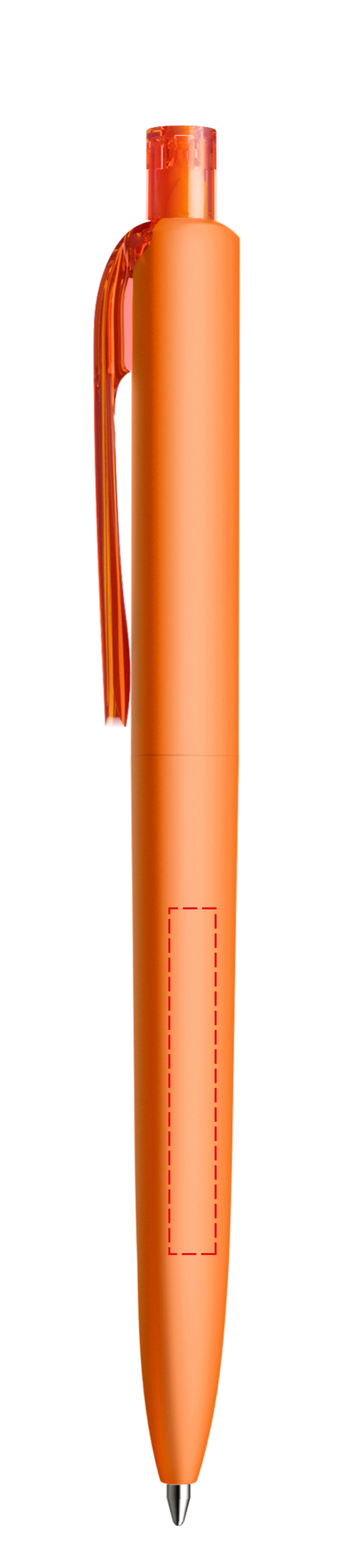 In der Ausführung mit Schaft in Soft Touch-Oberfläche (PRR) lieferbar in zehn Standardfarben, hergestellt mit einem Rezyklatanteil von 100% (Schwarz) oder 50% (alle anderen Farben), gekennzeichnet mit dem internationalen Recycling-Symbol. Sondergehäusefarben ab 5.000 Stück. Fünf Druckflächen für Werbeanbringungen stehen zur Verfügung. Clip und Druckknopf sind in transparenter Oberfläche. Polierter oder satinierter Metalldruckknopf als Option. Ausgestattet mit der umweltfreundlichen auswechselbaren FLOATING BALL® lead free-Großraummine 1.0, Schreiblänge 5.000 m, Schreibfarbe Blau oder Schwarz.