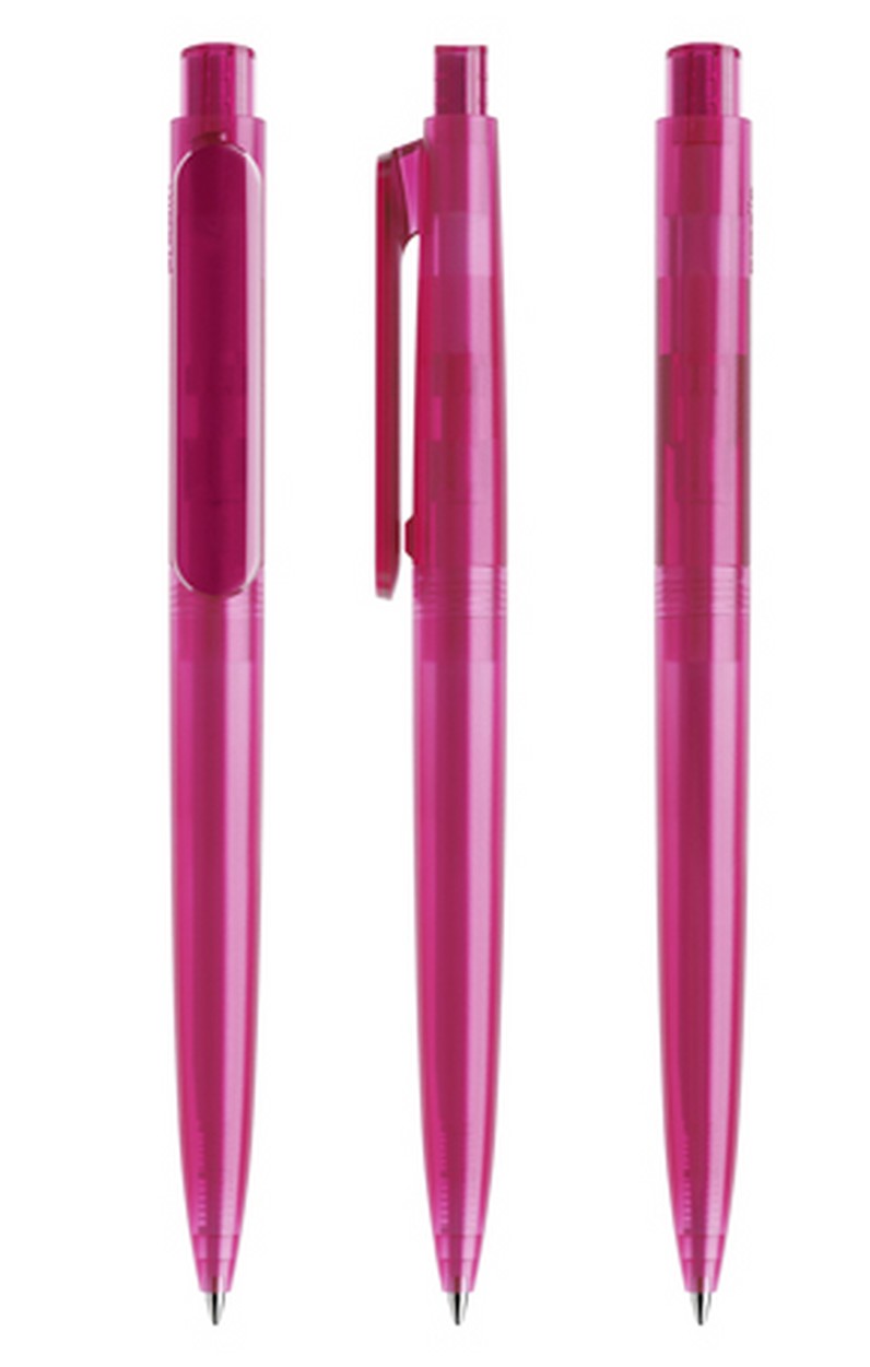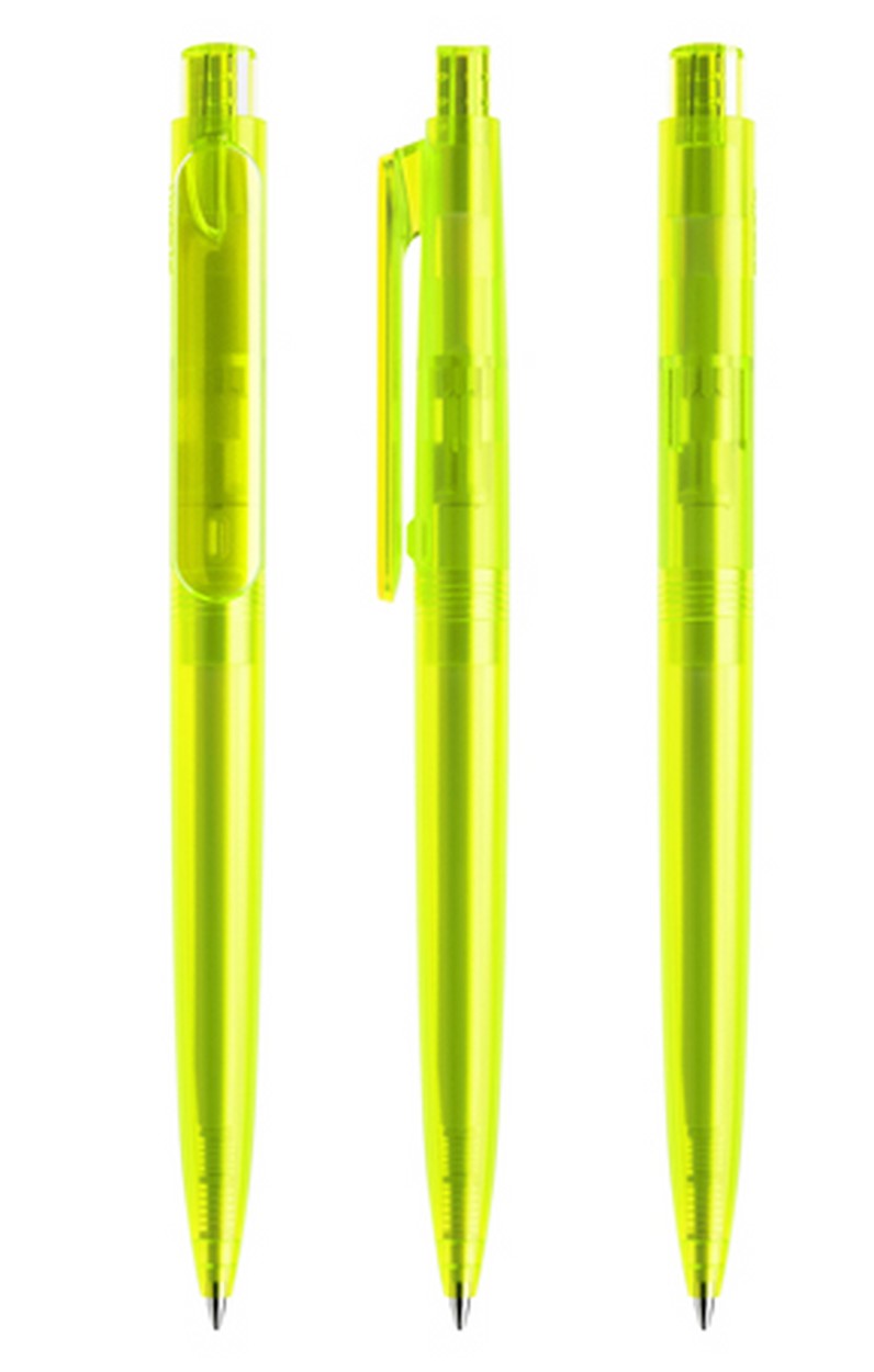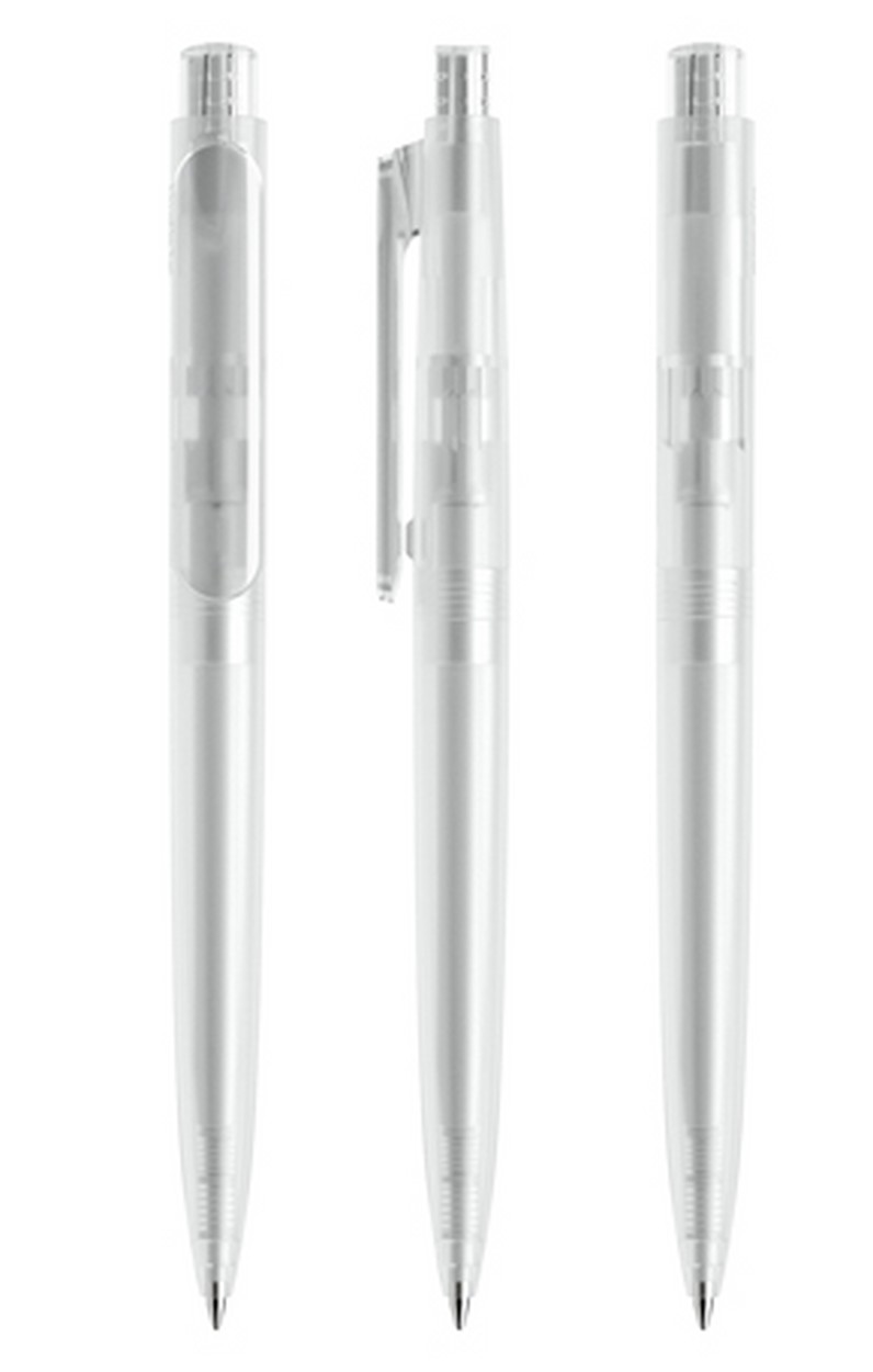 In der Ausführung mit gefrostetem Gehäuse und transparentem Clip/Druckknopf (PFF) lieferbar in sechs Standardfarben, Sondergehäusefarben ab 10'000 Stück. Vier Druckflächen für Werbeanbringungen stehen zur Verfügung. Der Druckknopf lässt sich farblich vom Gehäuse absetzen, besonders edel wirken Kombinationen mit poliertem oder satiniertem Metallknopf. Das hochwertige neue FLOATING BALL ® Schreibsystem sorgt für ein noch weicheres Schreibgefühl.