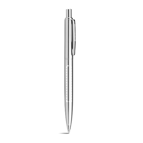 Kugelschreiber aus Edelstahl mit glänzendem Gehäuse und Clip. Mit blauschreibender Mine. Lieferung mit ungefalteter Geschenkbox. ø11 x 140 mm | Schachtel: 182 x 22 x 42 mm