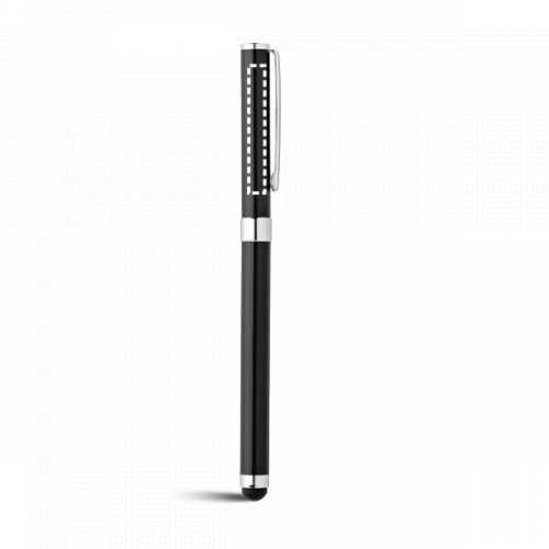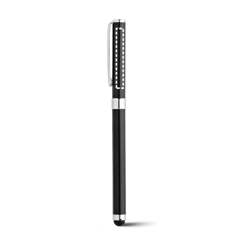 Rollerball aus Edelstahl mit glänzendem Körper, silbernen Details und schwarzschreibender Mine. ø9 x 141 mm | Etui: 150 x 15 x 19 mm