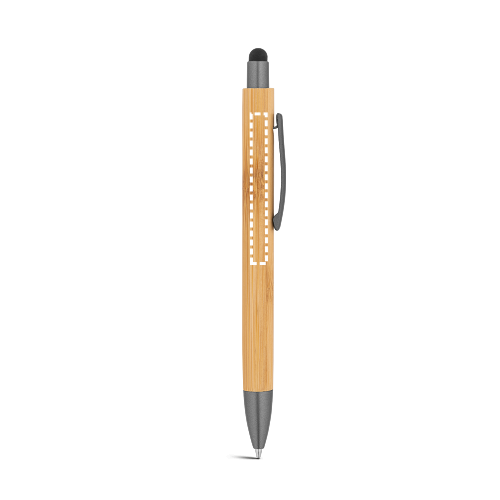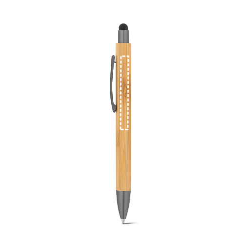 Kugelschreiber aus Bambus mit Clip aus Metall, PP Elemente und matter Oberfläche. Mit einer Schwarz Touchpenfunktion. Schwarzschreibende Mine. Da das Produkt aus natürlichen Materialien hergestellt wird, können Farbe des Produkts sowie das Druckergebnis von Produkt zu Produkt unterschiedlich sein. Ø11 x 141 mm