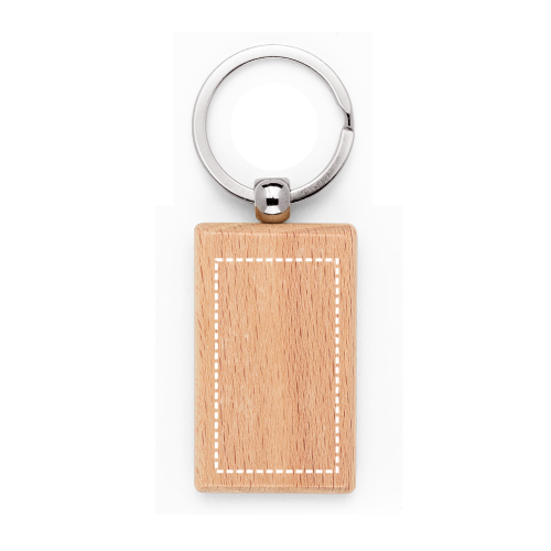 Rechteckiger Schlüsselanhänger aus Buchenholz mit Metallring. Da das Produkt aus natürlichen Materialien hergestellt wird, können Farbe des Produkts sowie das Druckergebnis von Produkt zu Produkt unterschiedlich sein. Ring: ø 32 mm | Produkt: 50 x 30 x 9 mm | Verbinder: ø 10 mm | Gesamt: 85 x 32 x 9 mm
