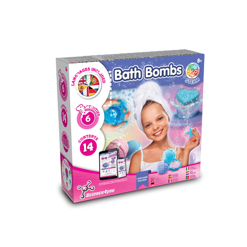 Lernspiel für Kinder zum Vorbereiten und Geniessen im Bad. Ein Kit zur Herstellung von glitternden und entspannenden Badebomben in verschiedenen Farben und Formen. Empfohlenes Alter: 8+ 233 x 218 x 63 mm
