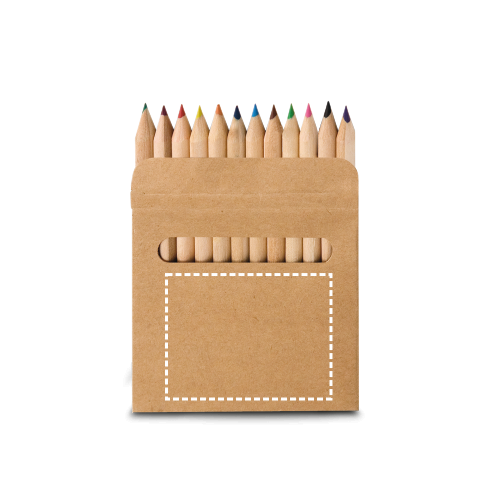 12 Holzbuntstifte in einer Kartonschachtel. 90 x 90 x 9 mm