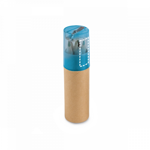 6 Holzbuntstifte in einer runden Kartonschachtel mit einem im Kunstoffdeckel integriertem Anspitzer. ø26 x 106 mm
