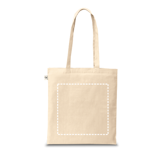 Tasche aus 100% recycelter Baumwolle (180 g/m²), mit 65 cm langen Henkeln. Recycelte Baumwolle ist einfarbig und ungefärbt. Das Rohmaterial wird in seiner ursprünglichen Form und Farbe verwendet, ohne dass Chemikalien zum Färben oder Bleichen eingesetzt werden, was zu einer geringeren Umweltbelastung beiträgt. Die einheitliche Farbe wird durch die Auswahl von recyceltem Garn mit demselben Farbton erzielt, wobei Verunreinigungen und Farbabweichungen auftreten können. 380 x 420 mm