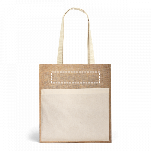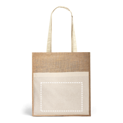 Tragetasche 100% Jute (240 g/m²) mit einer Vordertasche und 65 cm langen Henkeln, beides aus 100% Baumwolle (140 g/m²). 370 x 410 x 100 mm | Tasche: 370 x 270 mm