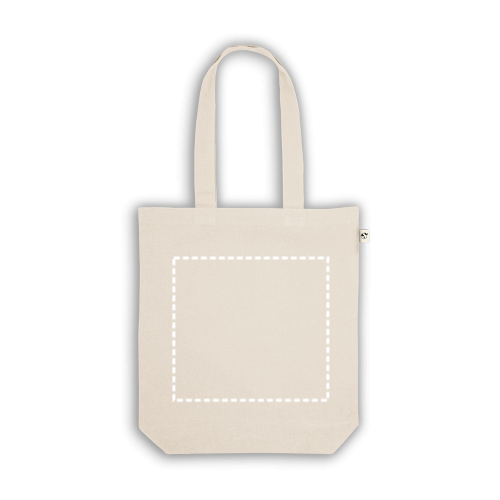 Tasche aus recycelter Baumwolle (70%) und Polyester (30% rPET)(280 g/m²), mit 65 cm langen Henkeln. Recycelte Baumwolle ist einfarbig und ungefärbt. Das Rohmaterial wird in seiner ursprünglichen Form und Farbe verwendet, ohne dass Chemikalien zum Färben oder Bleichen eingesetzt werden, was zu einer geringeren Umweltbelastung beiträgt. Die einheitliche Farbe wird durch die Auswahl von recyceltem Garn mit demselben Farbton erzielt, wobei Verunreinigungen und Farbabweichungen auftreten können. 380 x 400 x 100 mm