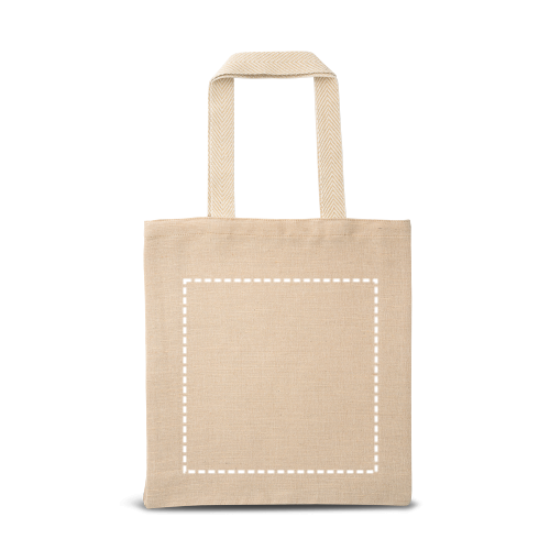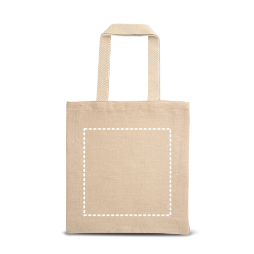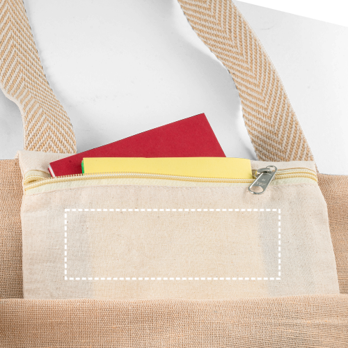 Tragetasche aus Juco (275 g/m²) mit einer Innentasche aus 100% Baumwolle (120 g/m²) mit Reißverschluss. 60cm Kurze Henkel aus zweifarbiger Baumwolle. 370 x 410 x 90 mm