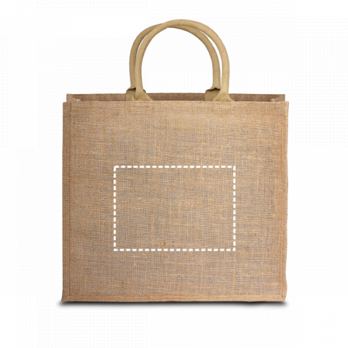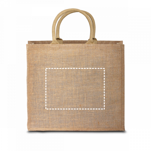 Tragetasche aus Jute (360 g/m²) mit Innenlaminat und kurzen gepolsterten Henkeln. 430 x 340 x 175 mm