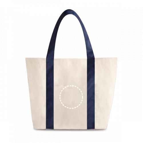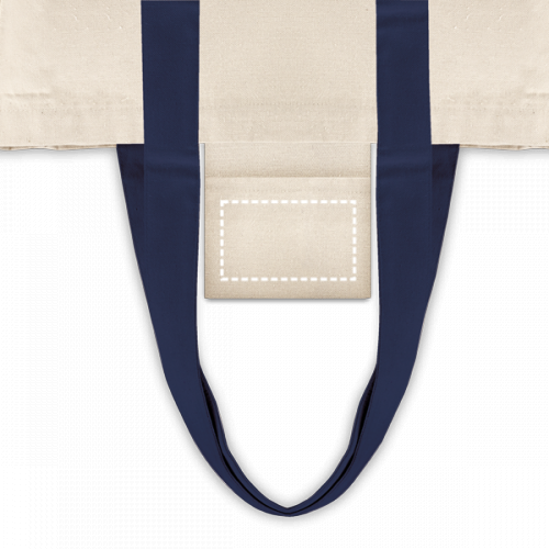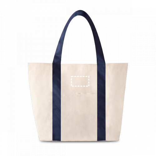 Tragetasche aus 100% Canvas Baumwolle (280 g/m²) mit Magnetverschluss, Innentasche mit Reißverschluss sowie einer Vordertasche und 60 cm langen Henkeln. 530 x 380 x 170 mm