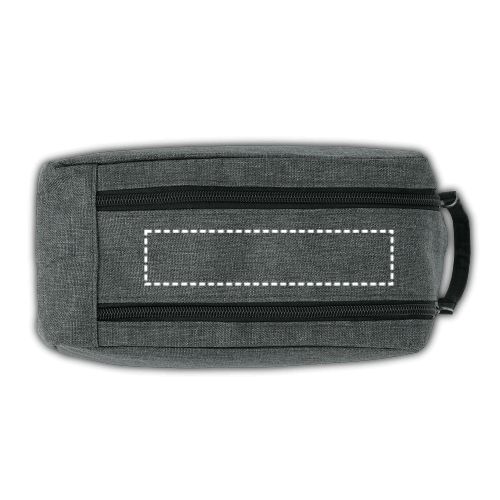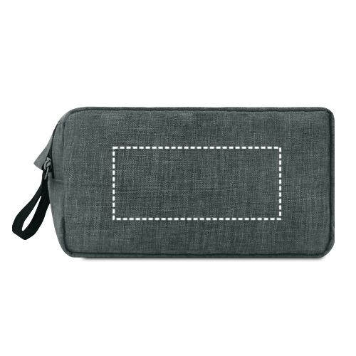 Kulturbeutel aus 600D HD mit einem Träger, der zur Öffnung des Doppelreissverschlusses dient und zum gefüttertem Innenbereich führt. 220 x 110 x 110 mm