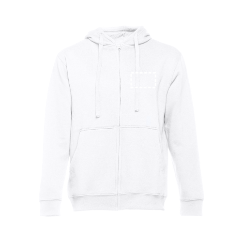 Herren Sweatshirt aus 50% Baumwolle und 50% Polyester (320 g/m²) mit kardierter Innenseite. Die Kapuze ist gefüttert und hat eine farblich abgestimmte Kordel. Auf der Vorderseite befinden sich 2 Beuteltaschen mit verdecktem Plastikreissverschluss. Ripp an Bund und Ärmeln. Größen: S, M, L, XL, XXL