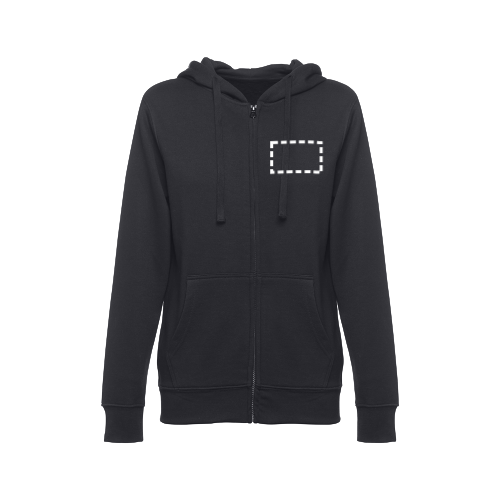 Damen Sweatjacke aus 50% Baumwolle und 50% Polyester (320g/m²) mit Reißverschluss und gefütterter Kapuze mit Kordelzug. Kardiert mit 2 Kängurutaschen, einem verdeckten Kunststoffreißverschluss und einem gerripten Bund. Größen: S, M, L, XL, XXL
