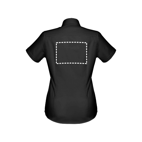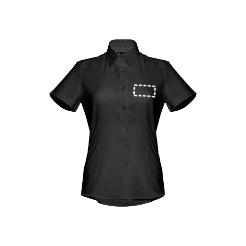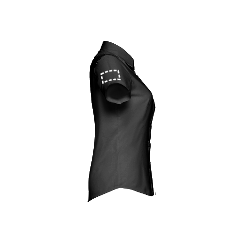 Damen kurzarm Oxford Bluse aus 70% Baumwolle und 30% Polyester (130g/m²), tailliert mit einer Knopfleiste mit 7 Knöpfen und je 2 Vorder- und Rückenfalten. Doppelnaht an den Ärmeln. Größen: S, M, L, XL, XXL