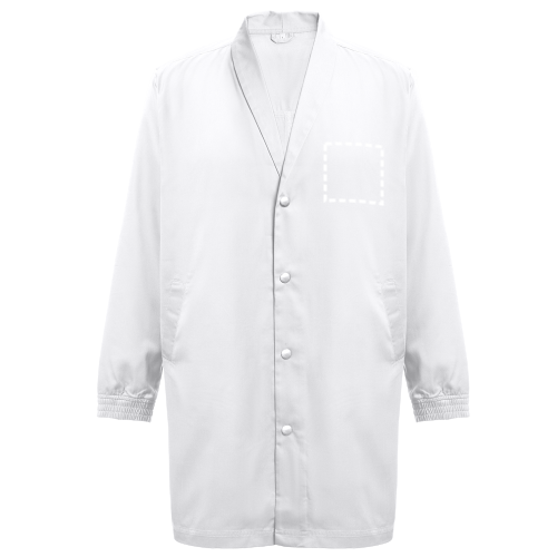 Arbeitskittel aus 20% Baumwolle und 80% Polyester (190g/m²), unisex. Eleganter, moderner und stilvoller Schnitt mit 2 Seitentaschen, elastische Bündchen und Druckknöpfen. Rückenöffnung für mehr Bewegungsfreiheit. Größen: S, M, L, XL, XXL, 3XL