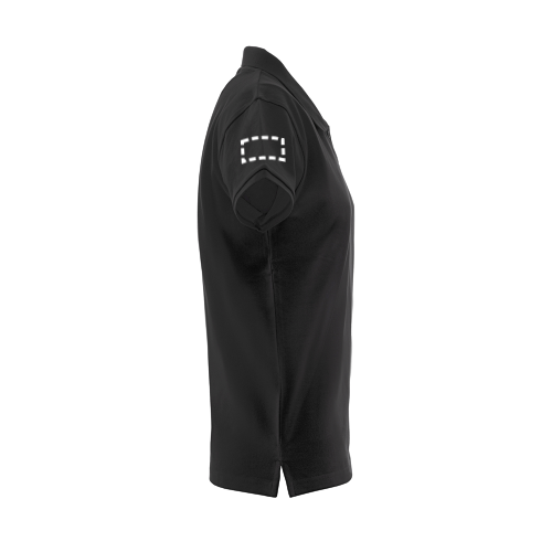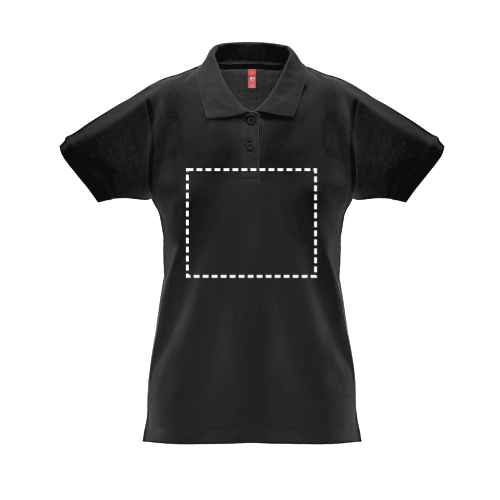 Damen Poloshirt aus Piqué Stoff 100% kardierter Baumwolle (240 g/m²), mit geripptem Kragen und Ärmel, Verstärkungsband am Kragen, seitliche Öffnungen, verstärkte Knopfleiste mit 2 farblich abgestimmten Knöpfen und einem Ersatzknopf an der Innennaht. Etikett entfernbar. Größen: S, M, L, XL, XXL
