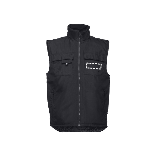 Herren Arbeitsweste aus 100% Polyester mit Acrylbeschichtung (170g/m²), gepolstert und gefuttert. Innenseite aus 100% Polyester-Taft (65g/m²) mit Polar Fleece Kragen. Die Weste hat 6 Taschen, 5 Taschen auf der Vorderseite davon 2 Taschen mit Reißverschluss, 1 Tasche für das Handy und 1 Innentasche. Elastisches Band an den Seiten. Der Reißverschlusszugang auf der Rückseite vereinfacht die Veredelung. Größen: S, M, L, XL, XXL, 3XL