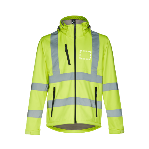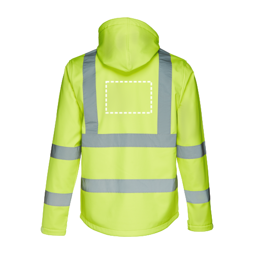 Herren Softshell-Jacke aus 100% Polyester (320g/m²), hohe Sichtbarkeit (Klasse III) und mit abnehmbarer, wasserabweisender und dreischichtiger Kapuze. Diese Jacke ist mit Fleecefutter ausgestattet, TPU beschichtet, hat 2 Vordertaschen und eine diagonale Brusttasche, beide mit Reißverschluss. Auch hat diese verstellbare Ärmelbündchen mit Klettverschluss, eine abnehmbare Kapuze mit Kordelzug, einen verstellbaren Stopper ebenfalls mit Klettverschluss. Abgerundete Rückenseite Größen: S, M, L, XL, XXL
