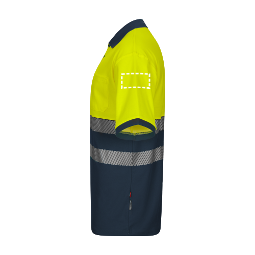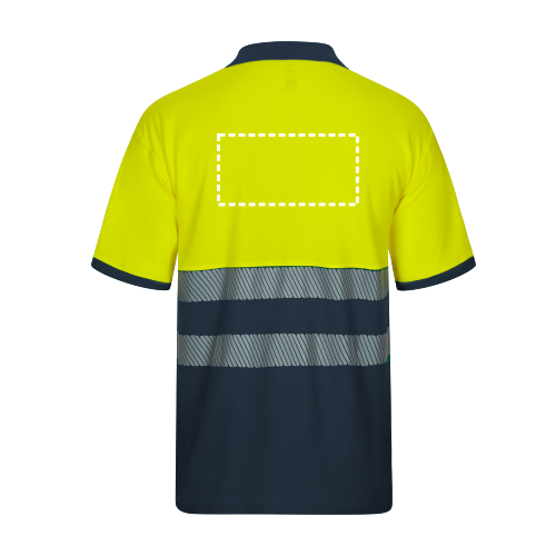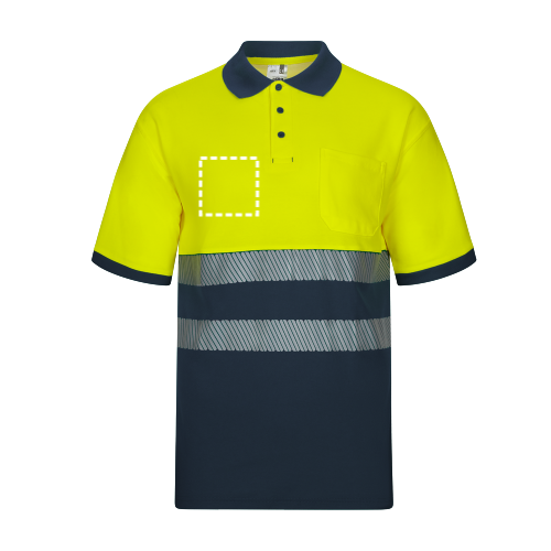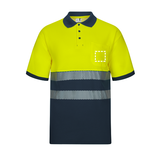 Zweifarbiges Piqué-Poloshirt (150g/m²) mit kurzen Ärmeln, aus Baumwolle (55%) und Polyester (45%). Knöpfe, gerippter Kragen und Saum in Kontrastfarbe. Segmentierte reflektierende Streifen auf dem Oberkörper. Enthält eine Brusttasche. Produkt gemäß EU-Verordnung 2016/425, zertifiziert nach EN20471 und Klasse Nº 1. Größe: S, M, L, XL, 2XL, 3XL