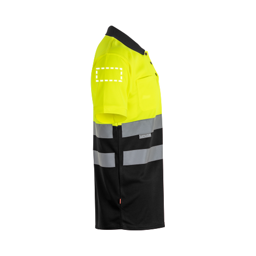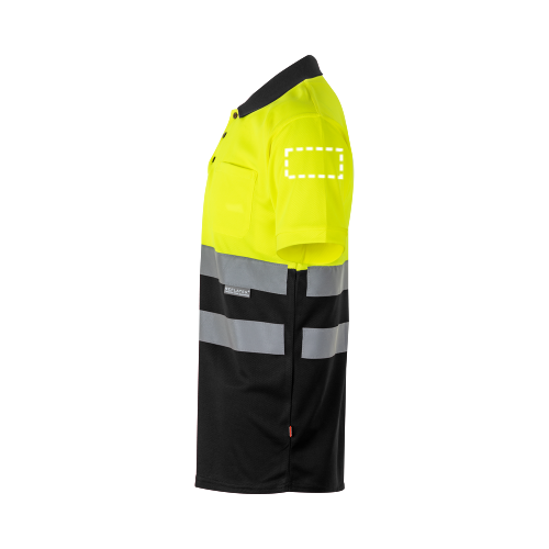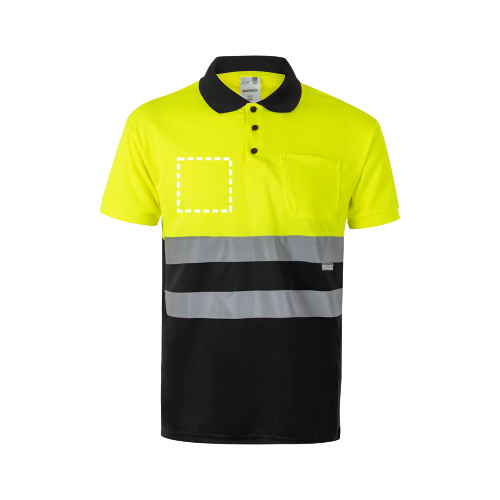 Zweifarbiges Poloshirt im Bird-Eye-Design (160g/m²) mit kurzen Ärmeln, aus Polyester (100%). Knöpfe und Kragen in Kontrastfarbe. Gerippter Kragen. Reflektierende Streifen auf dem Oberkörper. Inklusive einer Brusttasche. Produkt gemäß EU-Verordnung 2016/425, zertifiziert nach EN20471 und Klasse Nº 1. Größe: 4XL, 5XL