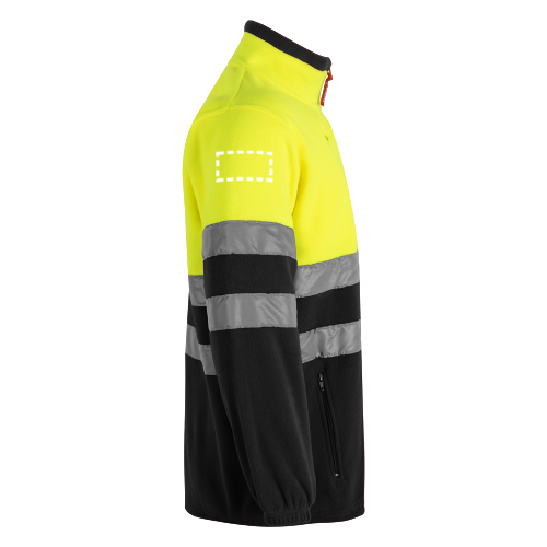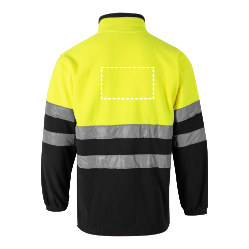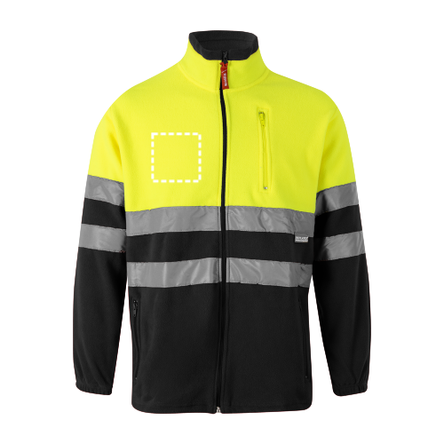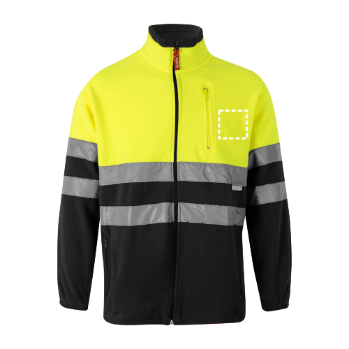 Zweifarbige Fleecejacke (280g/m²) aus Polyester (100%). Mit zentralem Reißverschluss, elastischen Ärmelbündchen und verstellbar mit Stopper an der Seite. Reflektierende Streifen auf dem Rumpf und den Ärmeln. Enthält drei Taschen, mit Reißverschluss. Produkt gemäß EU-Verordnung 2016/425, zertifiziert nach EN20471 und Klasse Nº 1. Größe: XS, S, M, L, XL, 2XL, 3XL