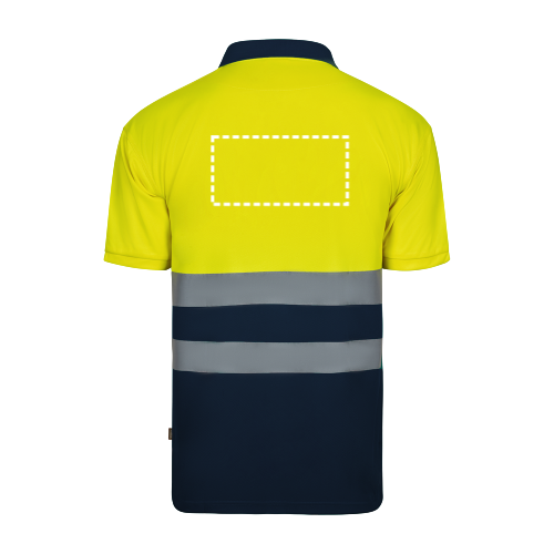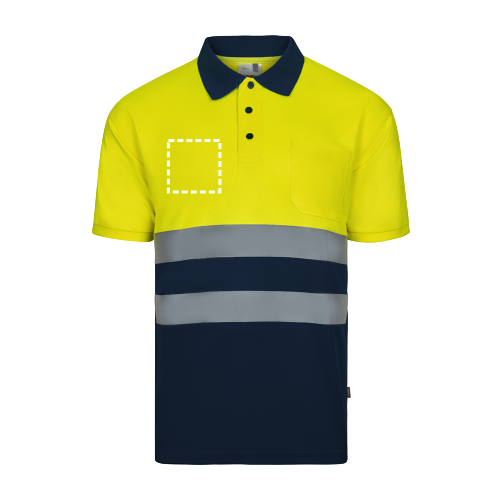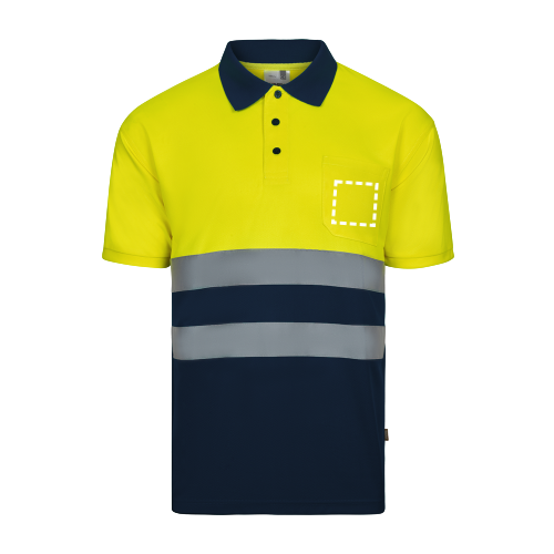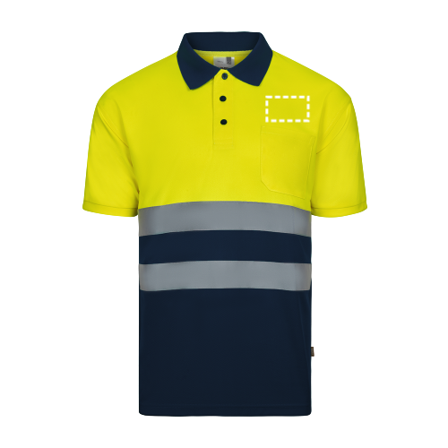 Poloshirt (140g/m²) im Bird-Eye-Design mit kurzen Ärmeln, aus Polyester (100%). Kontrastfarbene Knöpfe und gerippter Kragen. Reflektierende Streifen auf der Brust und eine Brusttasche. Produkt gemäß EU-Verordnung 2016/425, zertifiziert nach EN20471 und Klasse Nº 1. Größe: S, M, L, XL, 2XL, 3XL