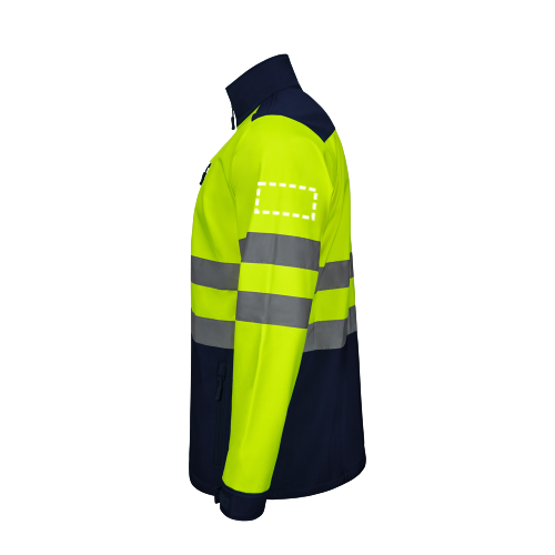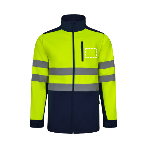 Zweifarbige Softshell-Jacke (280 g/m²), mit Fleece-Futter und TPU-Membran, aus Polyester (96%) und Elastan (4%). Dreilagiges Gewebe, mit umgekehrtem Zentralreißverschluss in Kontrastfarbe, oben umgeschlagene Innenleiste, verstellbare Bündchen mit Klettverschluss. Reflektierende Streifen auf der Brust und den Ärmeln. Enthält fünf Taschen: 3 Taschen mit Reißverschlüssen und 2 aufgesetzte Innentaschen. Produkt gemäß EU-Verordnung 2016/425, zertifiziert nach EN20471 und Klasse Nº 2. Größe: 4XL,5XL