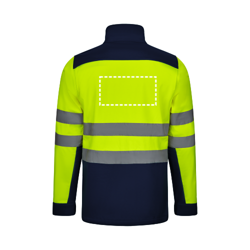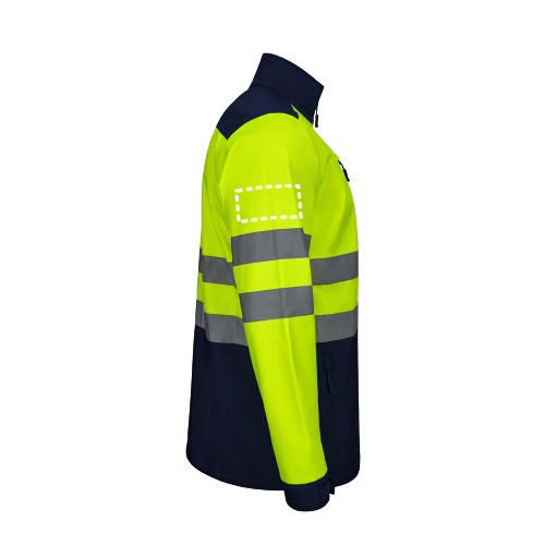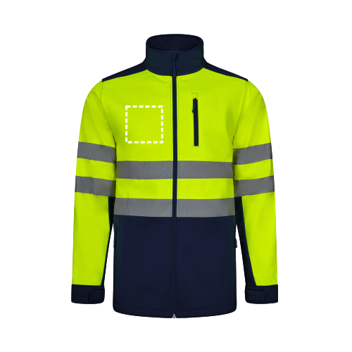 Zweifarbige Softshell-Jacke (280g/m²) aus Polyester (96%) und Elastan (4%). TPU-beschichtet und mit Fleece gefüttert. Zentraler umgekehrter Reißverschluss in Kontrastfarbe, verstellbare Bündchen mit Klettverschluss. Reflektierende Streifen auf dem Rumpf und den Ärmeln. Enthält fünf Taschen: 3 Reißverschlusstaschen und 2 Innentaschen. Produkt gemäß EU-Verordnung 2016/425, zertifiziert nach EN20471 und Klasse Nº 2. Größe: S, M, L, XL, 2XL, 3XL