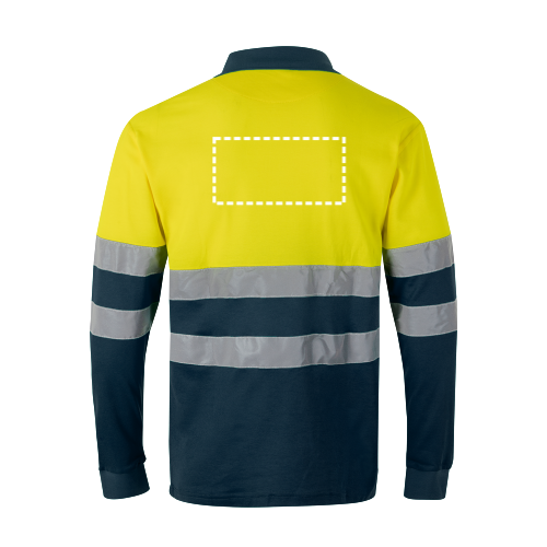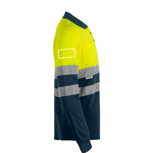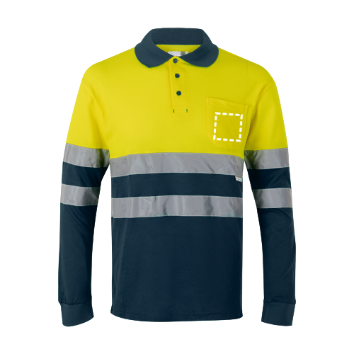 Langärmeliges, zweifarbiges Piqué-Poloshirt (150g/m²) aus Baumwolle (55%) und Polyester (45%). Knöpfe und Kragen in Kontrastfarbe. Kragen und Manschetten gerippt. Reflektierende Streifen auf dem Rumpf und den Ärmeln. Inklusive einer Brusttasche. Produkt gemäß EU-Verordnung 2016/425, zertifiziert nach EN20471 und Klasse Nº 1. Größe: 4XL,5XL