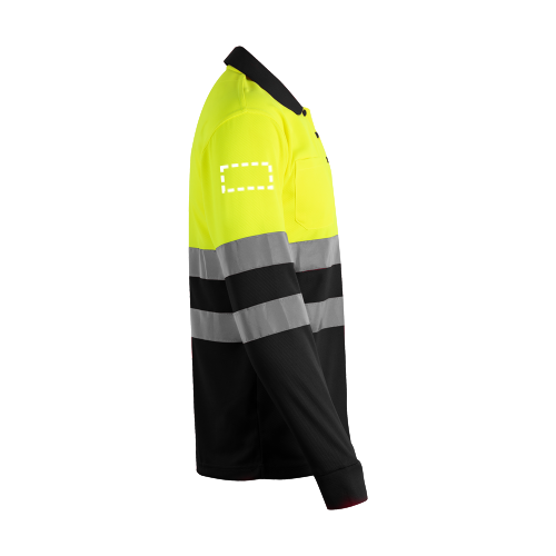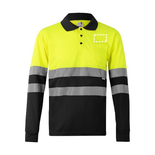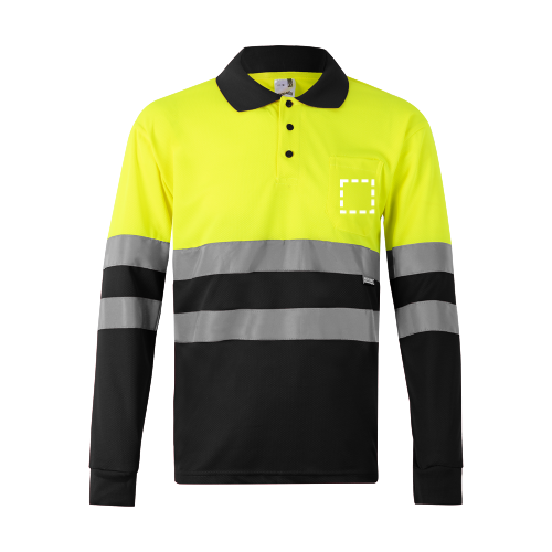 Zweifarbiges Poloshirt im Bird-Eye-Design (160g/m²) mit langen Ärmeln, aus Polyester (100%). Knöpfe in Kontrastfarbe, gerippter Kragen und Manschetten ebenfalls in Kontrastfarbe. Reflektierende Streifen auf dem Rumpf und den Ärmeln. Produkt gemäß EU-Verordnung 2016/425, zertifiziert nach EN20471 und Klasse Nº 1. Größe: 4XL, 5XL