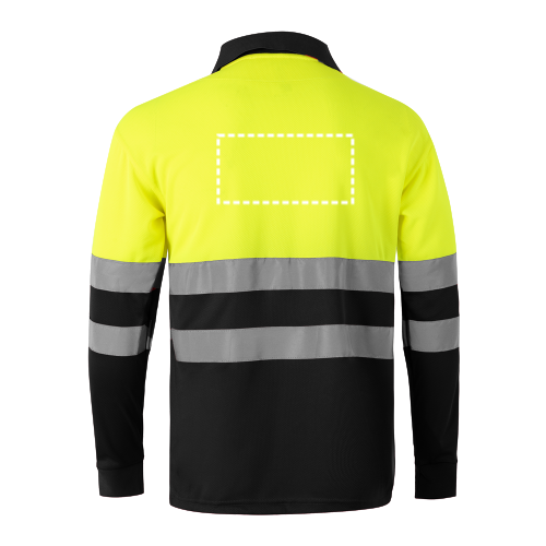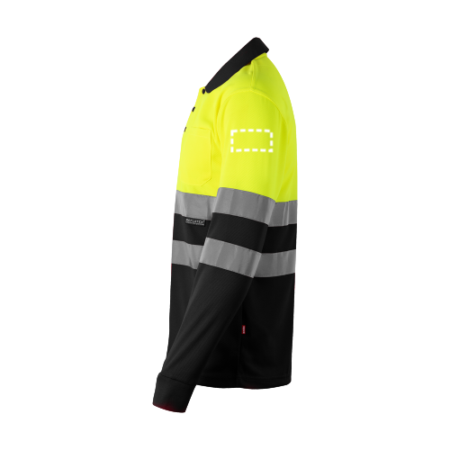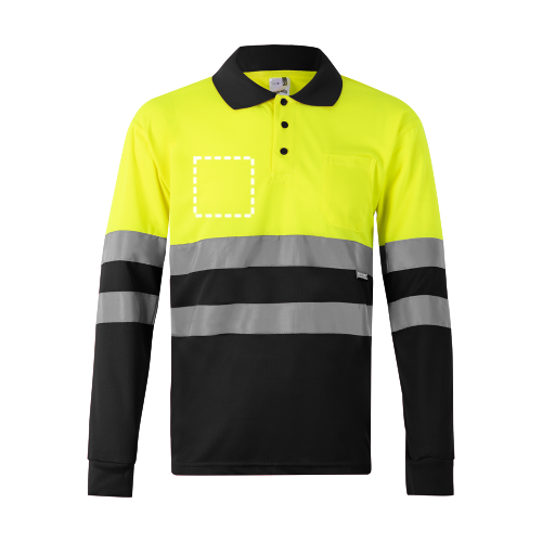 Zweifarbiges Poloshirt im Bird-Eye-Design (160g/m²) mit langen Ärmeln, aus Polyester (100%). Knöpfe in Kontrastfarbe, gerippter Kragen und Manschetten ebenfalls in Kontrastfarbe. Reflektierende Streifen auf dem Rumpf und den Ärmeln. Produkt gemäß EU-Verordnung 2016/425, zertifiziert nach EN20471 und Klasse Nº 1. Größe: XS, S, M, L, XL, 2XL, 3XL
