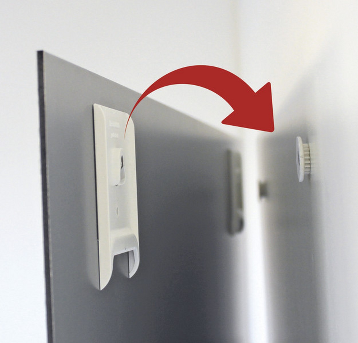 fissart ist ein cleveres, rahmenloses und unsichtbares aufhängesystem für bilder, paneele oder werbetafeln. das system besteht aus einer montageplatte und einer befestigungsscheibe. die montageplatte ist mit einem randabstandbügel mit abreißhilfe ausgestattet: sie kann deshalb ganz einfach und schnell ohne massband mit dem gelieferten doppelkleber auf das paneel geklebt werden. das paneel wird sodann in die wandmontierte befestigungscheibe eingehakt. bei bedarf kann die montageplatte auch aufgeschraubt werden. das zahnradsystem an der montageplatte sorgt dafür, dass das paneel sicher hält und nicht verrutscht. zudem kann das paneel nach der montage einfach nachjustiert werden.