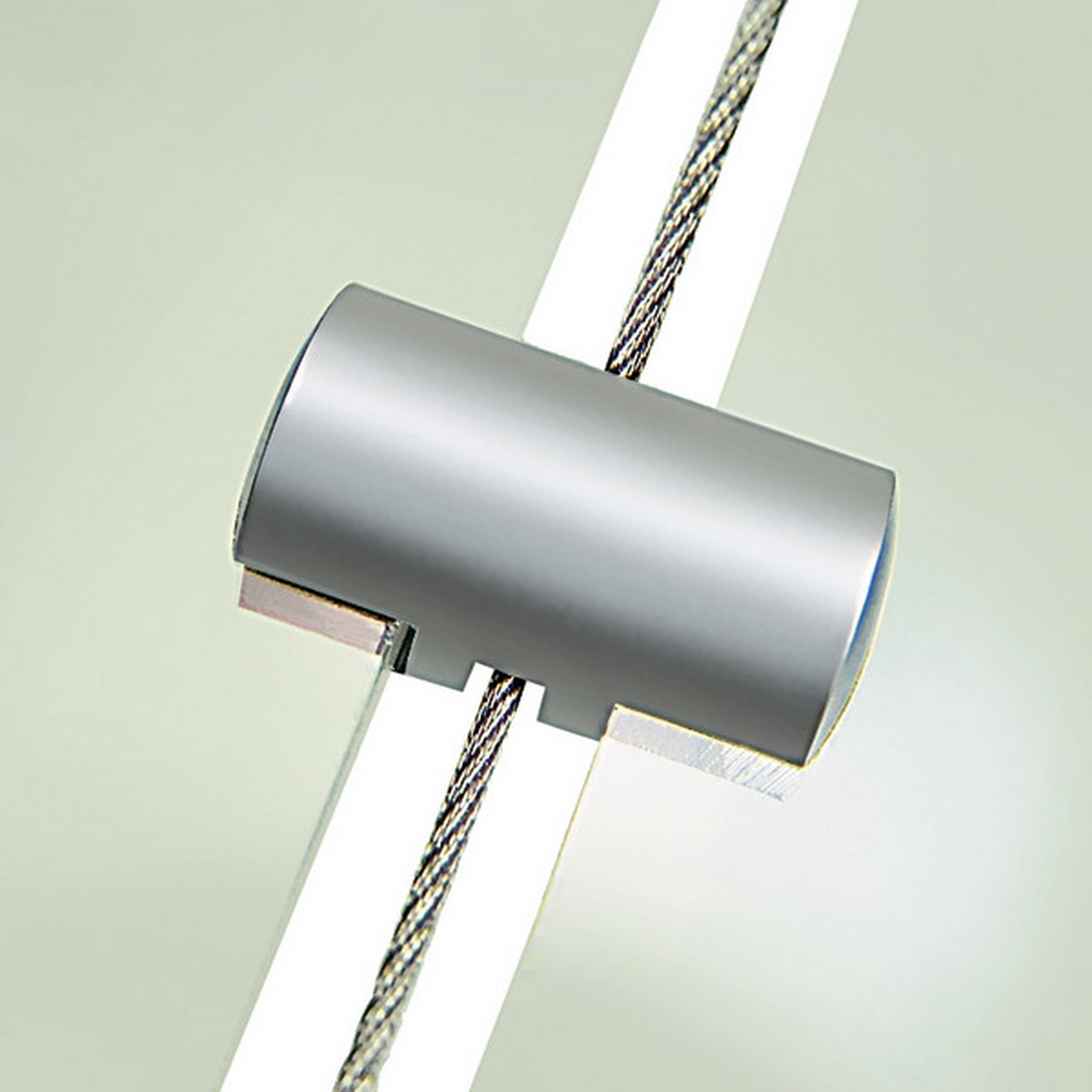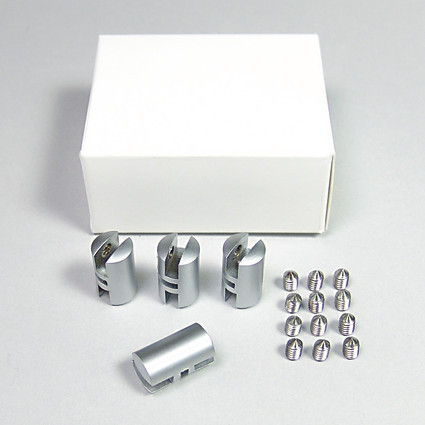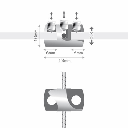Paneelhalter für Seil, beidseitig. Seitlicher Halter für zwei Paneele am Stahlseil. Befestigung von Paneel und Seil mit Madenschrauben. Befestigung: seitlicher Halter für 2 Paneele für Seil, Schraubsystem. Material: Messing, versilbert. Plattenstärke: max. 3 mm. Seilstärke: max. Ø 1,2 mm.