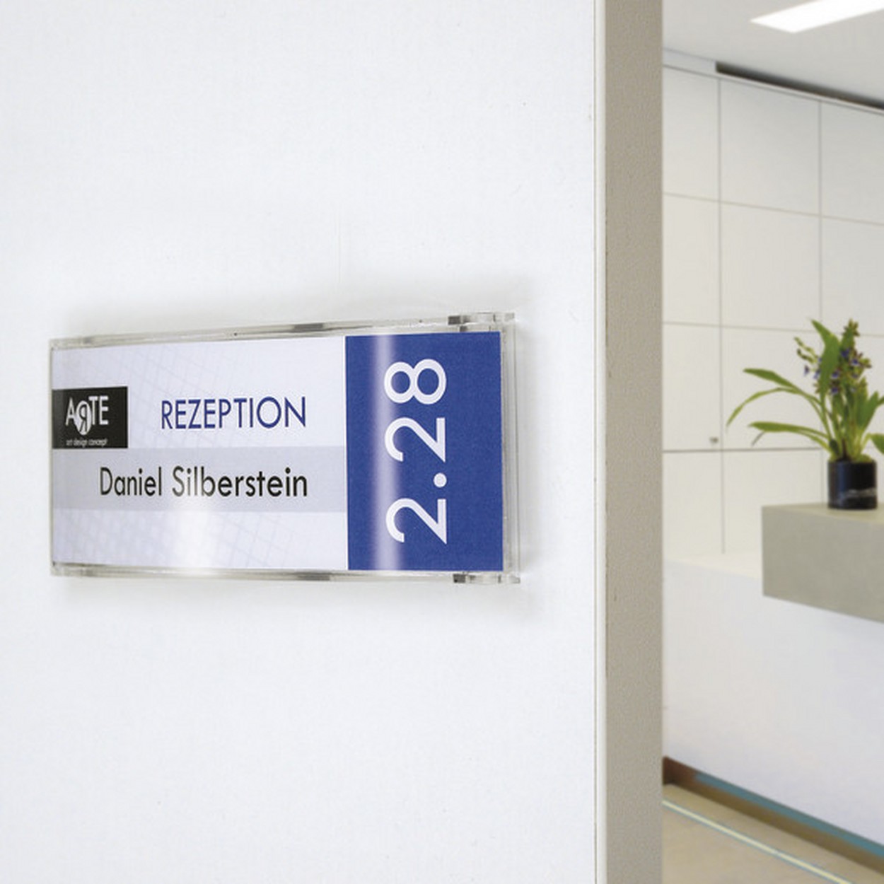 Cleveres Design: funktioneller Inforahmen, der als Thekenaufsteller oder Wandschild für häufig zu wechselnde Info dient. Rahmenlos und staubgeschützt, Frontpaneel abnehmbar oder aufklappbar, robuster Polycarbonat Spritzguss.