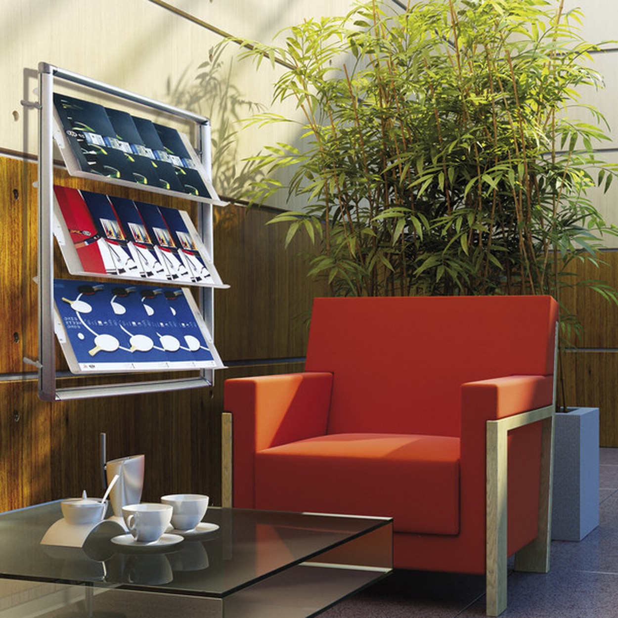 Wallmate ist Ihre Wahl für die wandmontierte Präsentation. Die drei satinierten Acrylglasablagen bieten ausreichend Platz und eignen sich neben Katalogen insbesondere auch für Zeitungen. Die Ablagen können Sie in der Höhe stufenlos verstellen.
