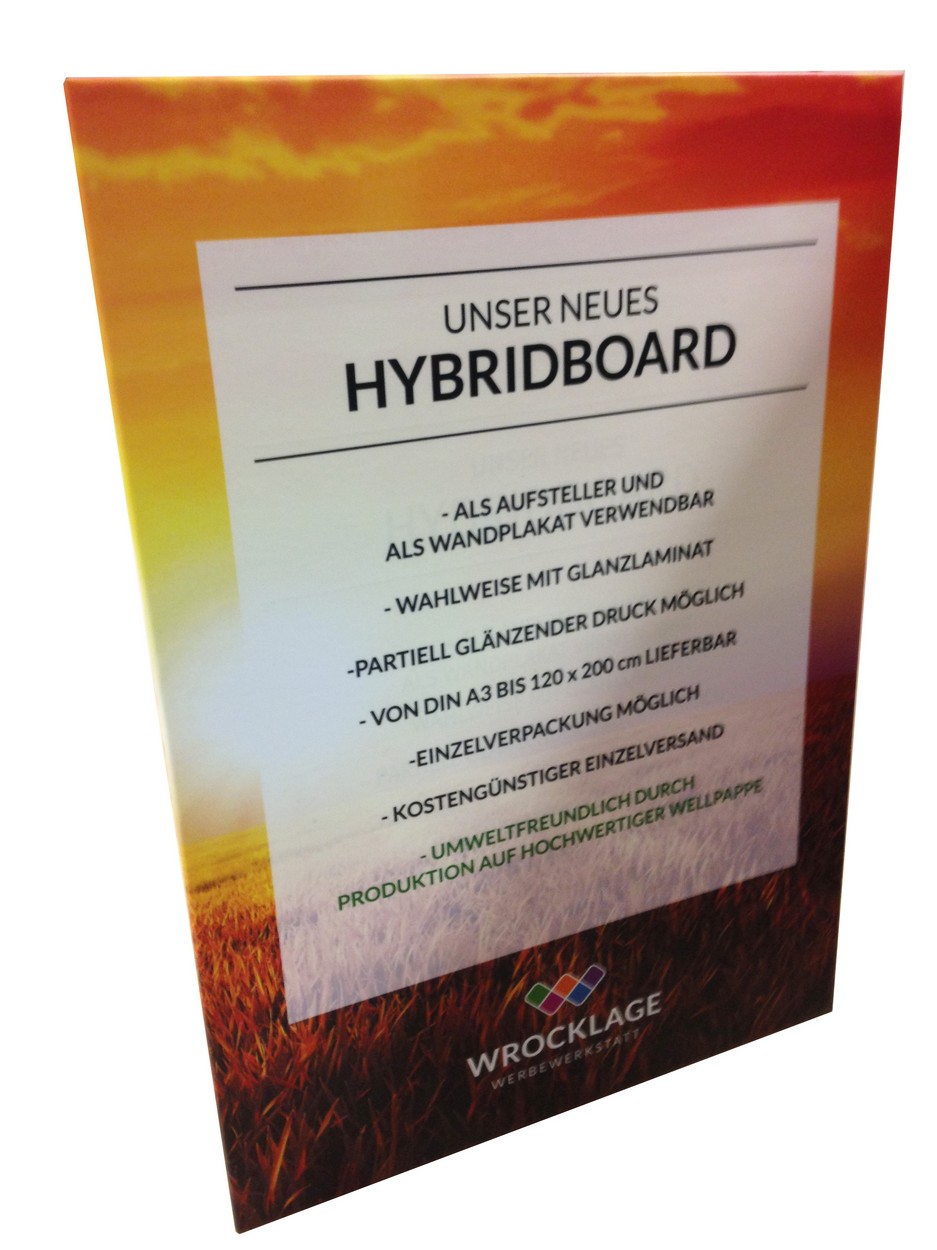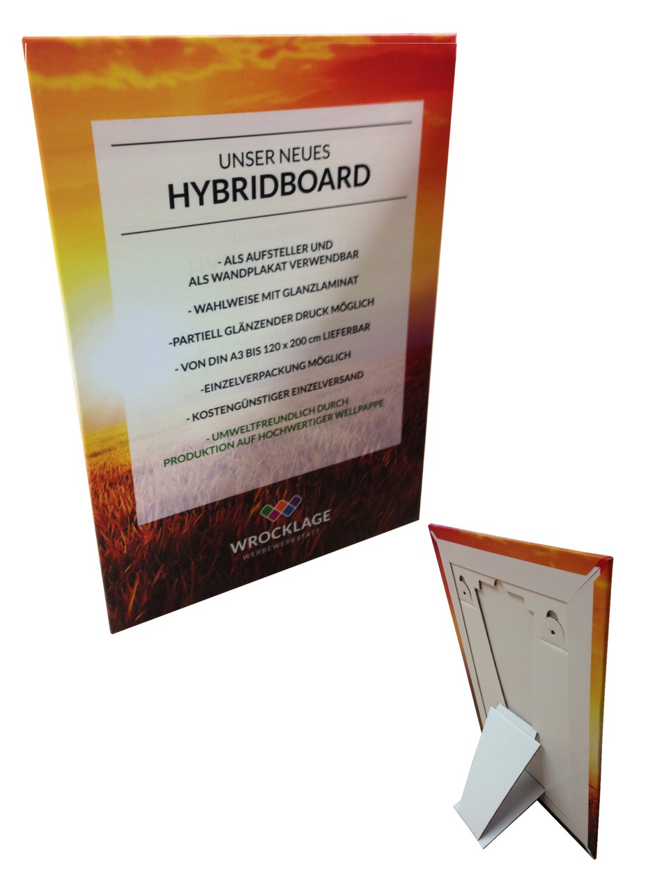 Unser neues Hybridboard ist als Wandplakat oder Pappaufsteller einsetzbar. Es wird individuell angefertigt und ist in allen Format zwischen DIN A3 und 1200 x 2000 mm lieferbar.