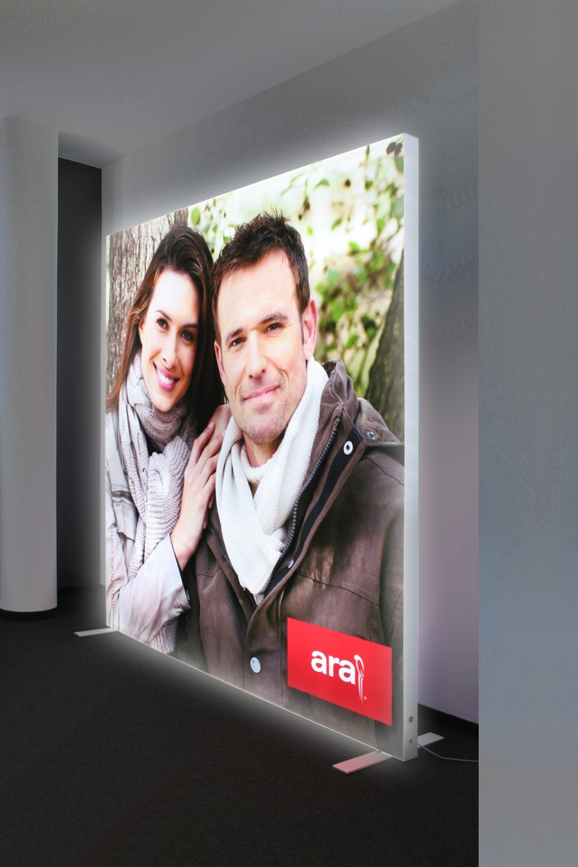 Der TEXframe 85 LED setzt dank leistungsstarken LED-Flutern Ihren Textildigitaldruck optimal in Szene! Er lässt sich als Standmodul oder Wanddisplay einsetzen und ist als ein- und beidseitig beleuchtete Variante erhältlich.