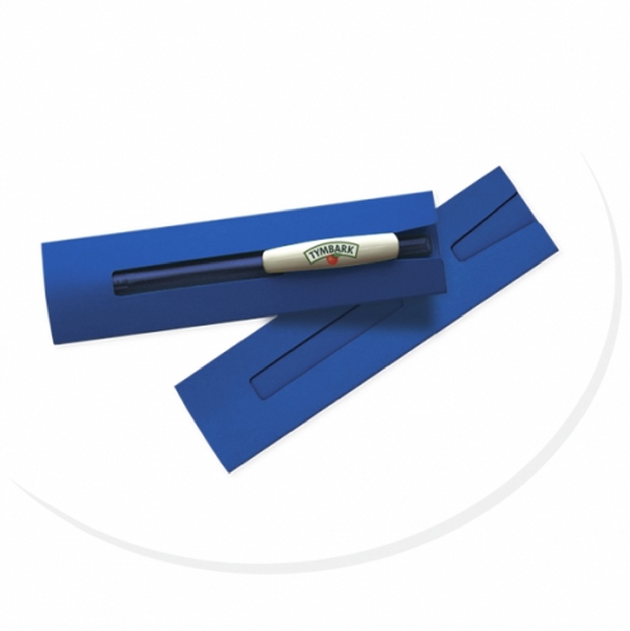 Das farbige Papieretui für den einzelnen Kugelschreiber, versehen mit Ihrem Logo.
