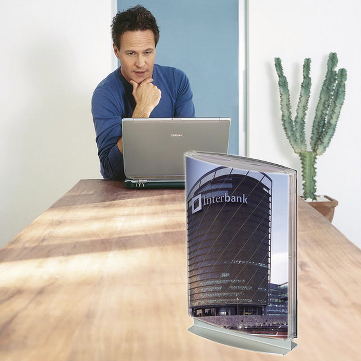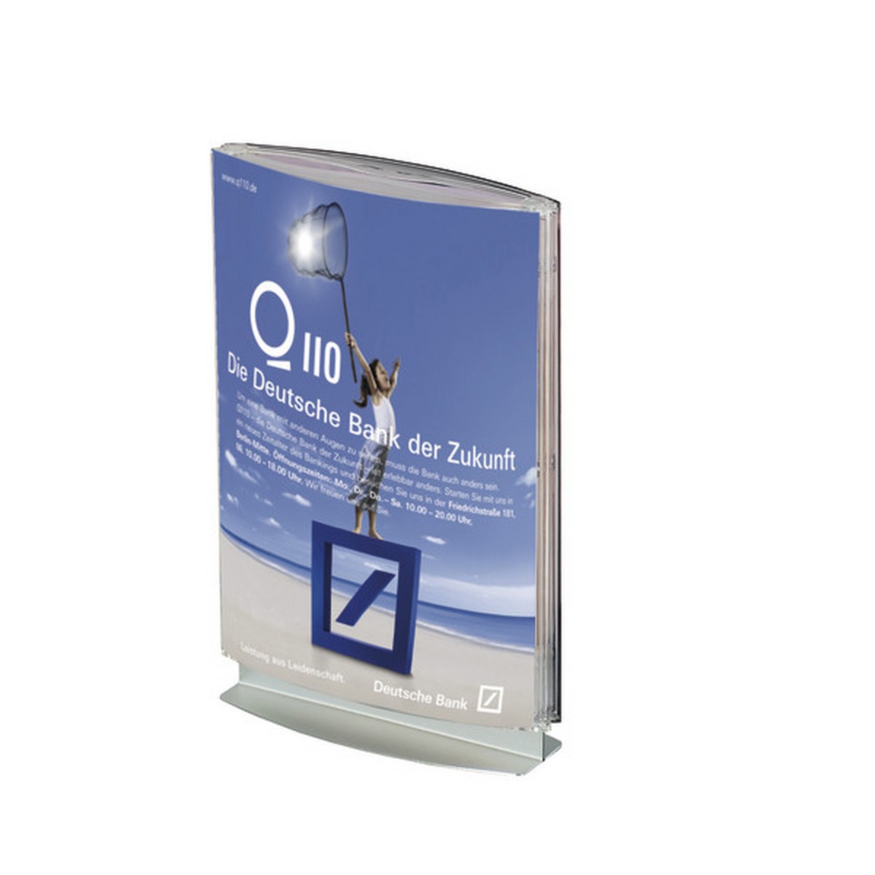 Egal ob als zweiseitiger Menükartenhalter für den Tisch oder als Preisinformation auf der Hoteltheke: Der doppelseitige Thekenaufsteller Pixquick Pylon punktet mit zwei Postertaschen im Format DIN A6, A5 oder A4 und ermöglicht einen blitzschnellen, einfachen Austausch der präsentierten Infos.